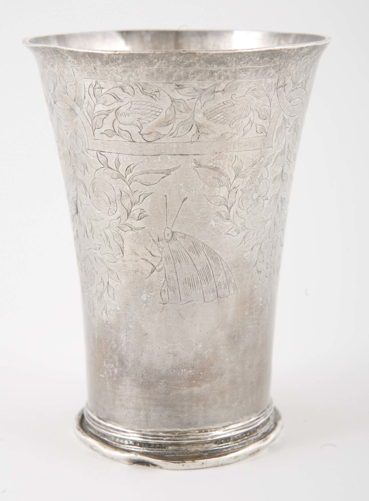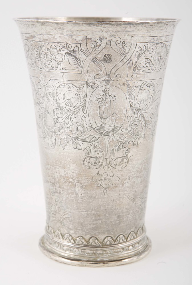 Gildebeker van zilver, op ronde voet, met rijke grav...
