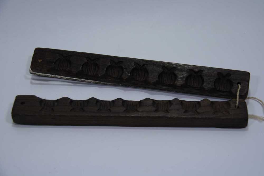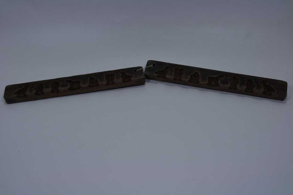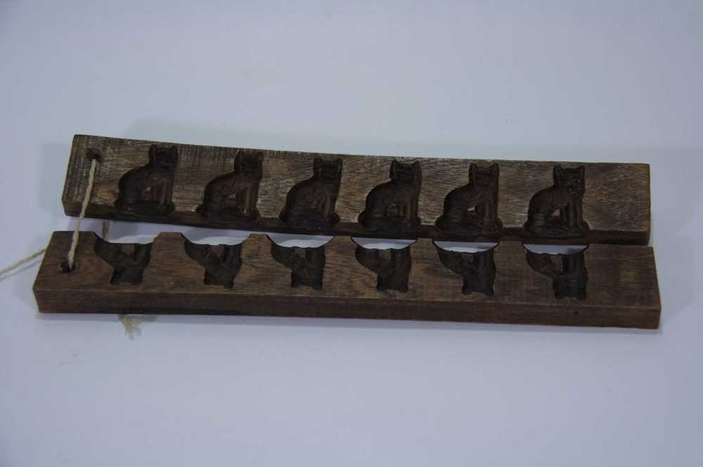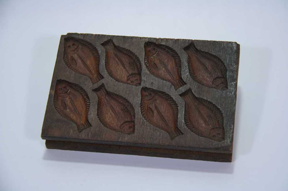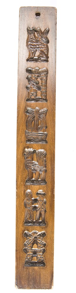 Suikerwerkplank van hout met 7 figuren, o.a. een vog...