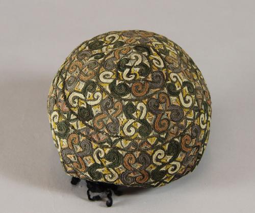 : Silk (ground and lining) with several types of metal thread; metal thread lace and plaited band and sequins; linen (interlining) (1)