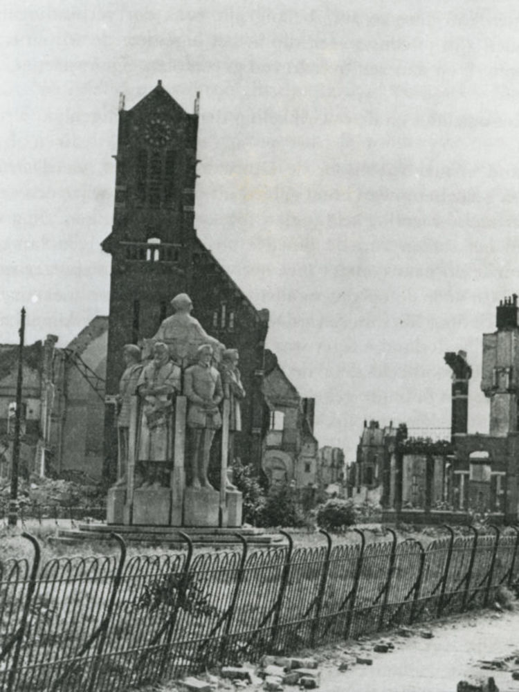 Foto van gesloopte gebouwen. Een kerk staat deels no...