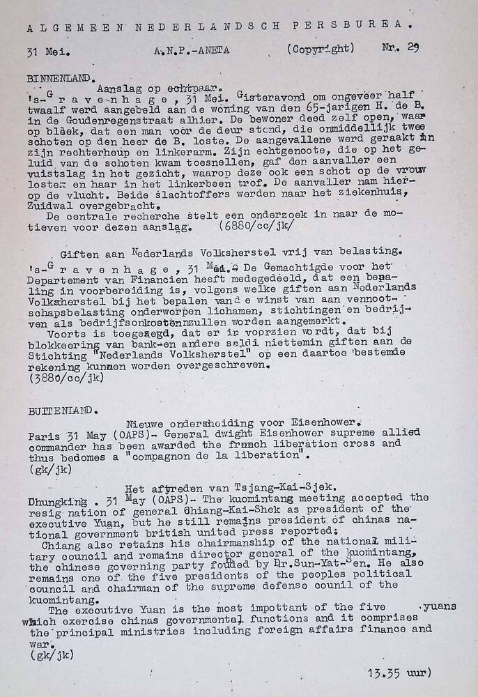Algemeen Nederlandsch Persbureau, mededelingen, 31 m...