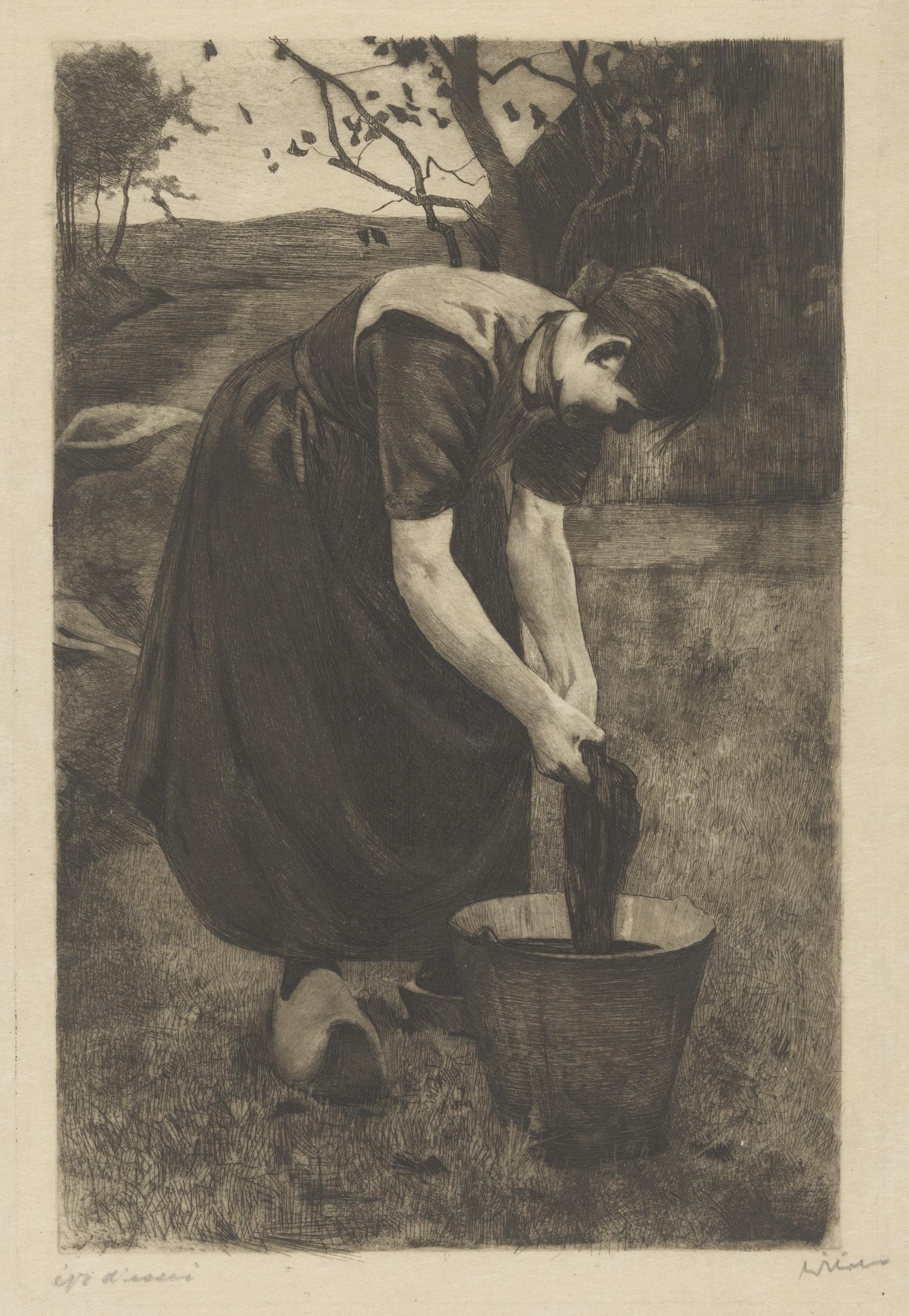 Gravende boerin bij kalf