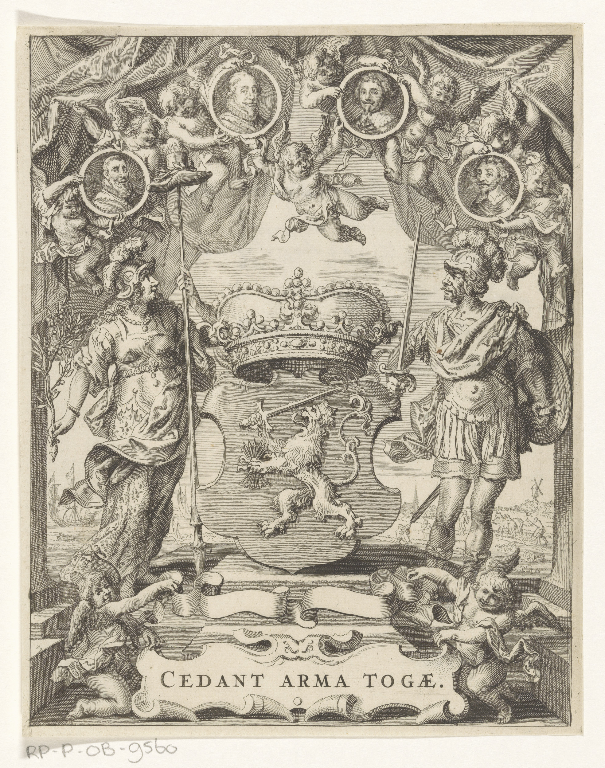 Wapen van Holland geflankeerd door man en vrouw