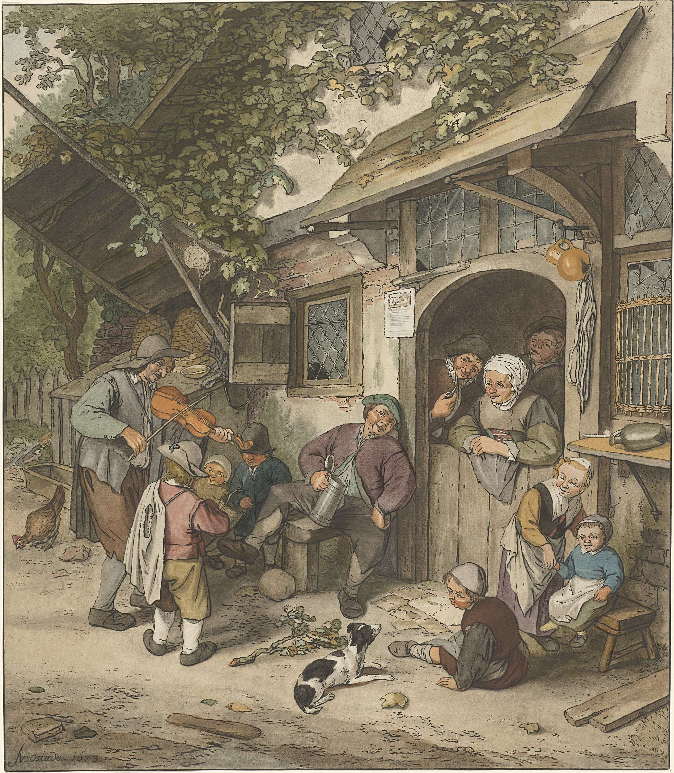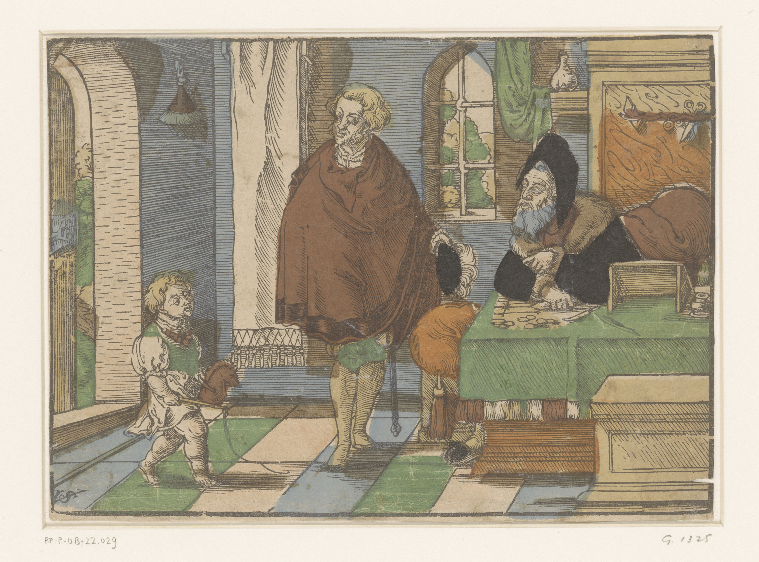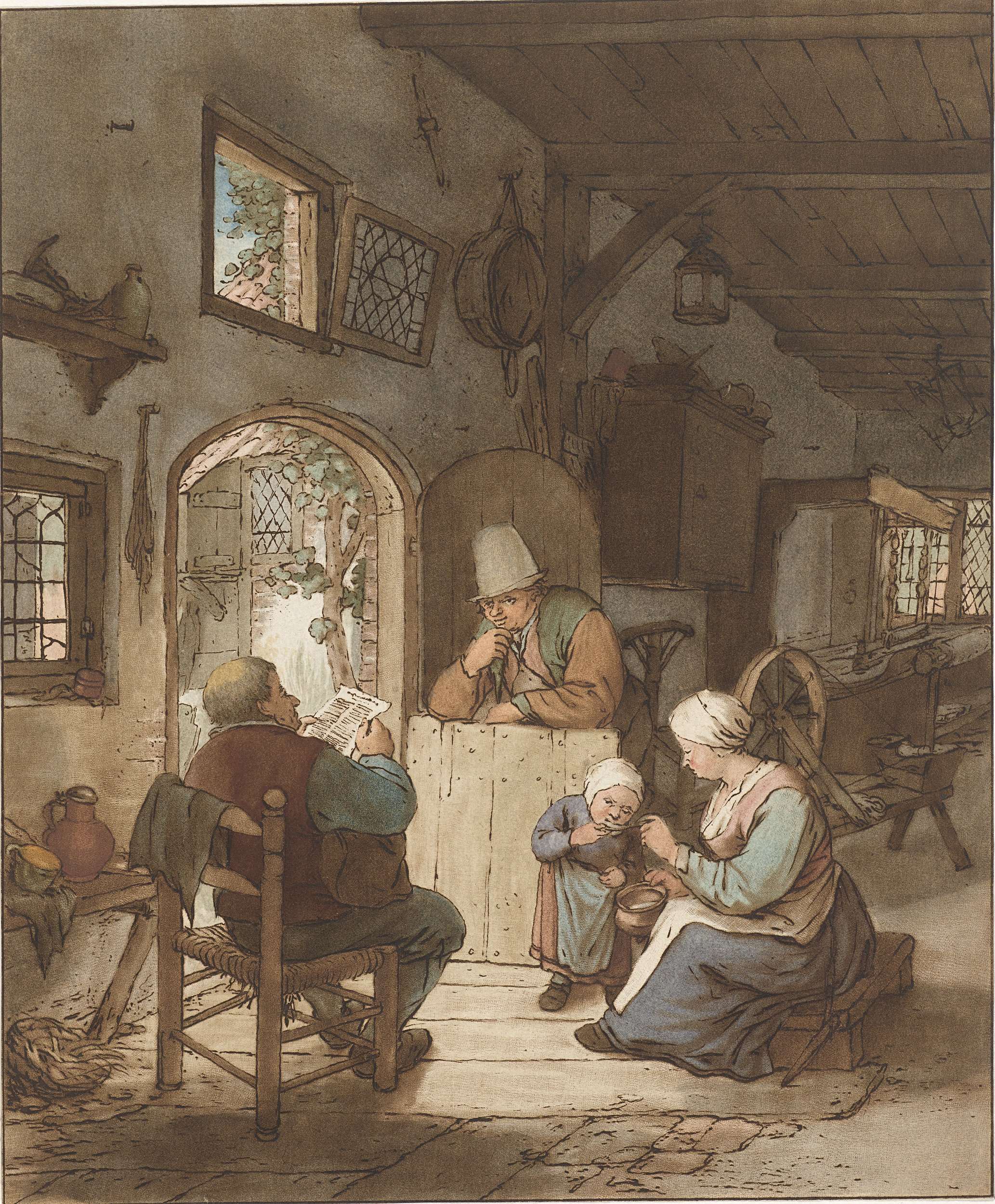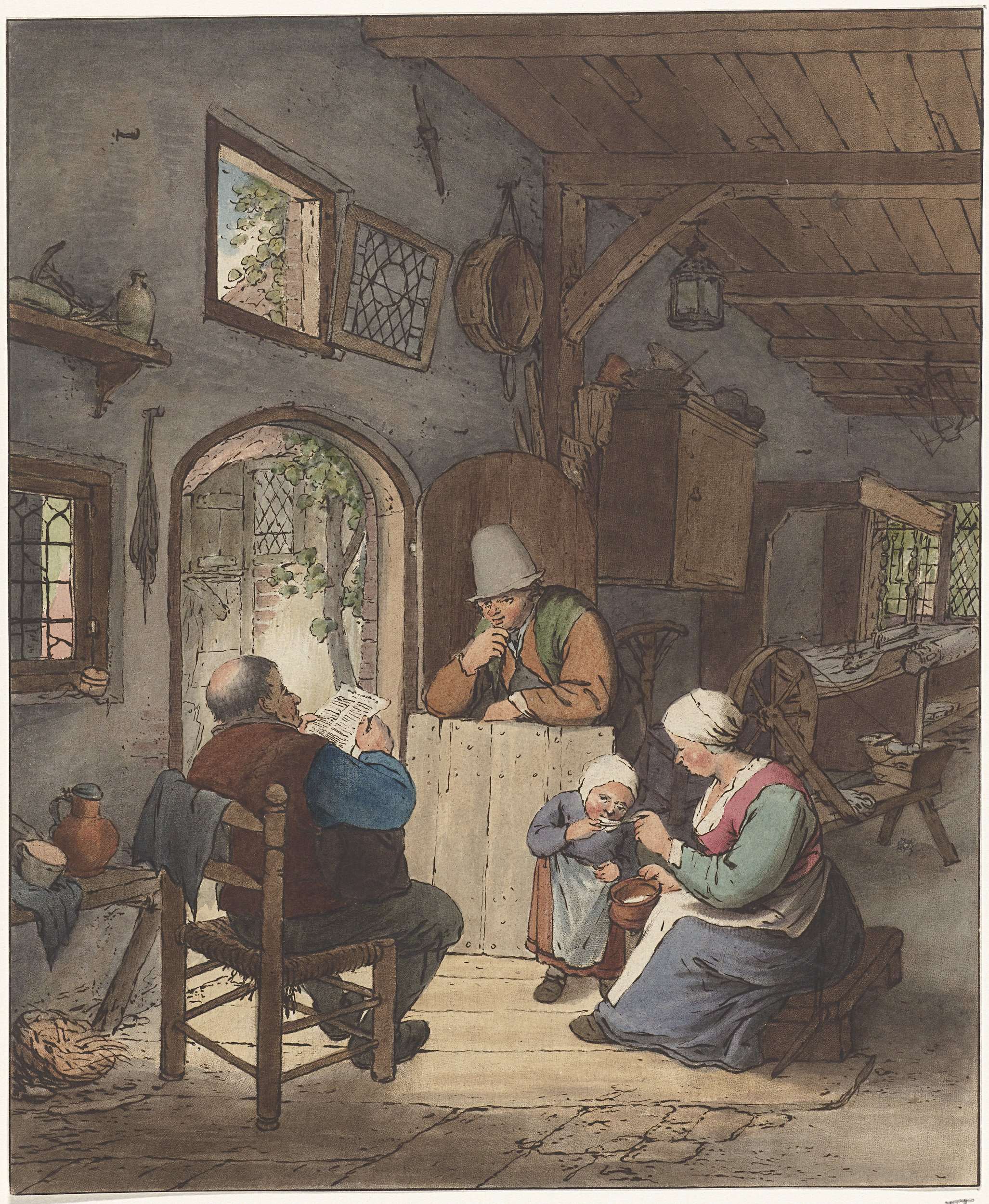 Interieur met een oude man, jongeman en kind met een...