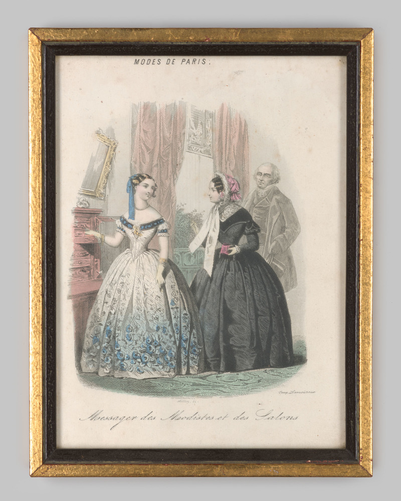 Modeprent van twee vrouwen en een man in een interieur