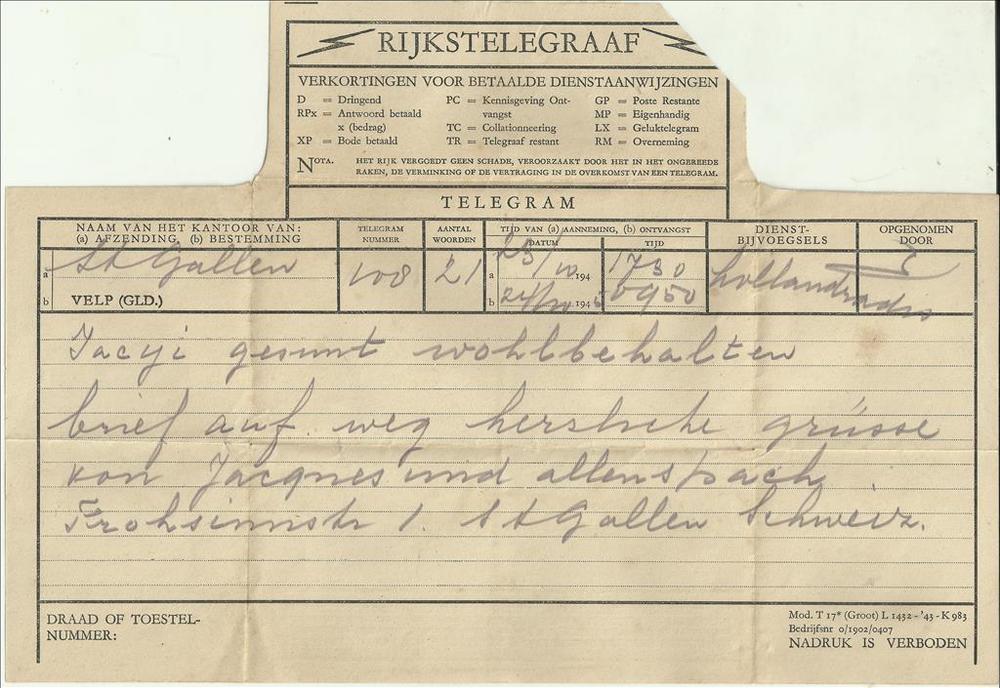 Telegram uit St. Gallen uit oktober 1945 betreffende...