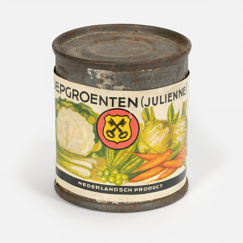 Blikje met daarop de volgende tekst: Soepgroenten (j...