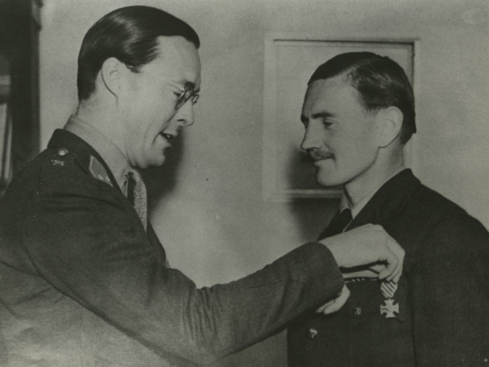 Foto Prins Bernhard onderscheidt piloot met Vliegerk...