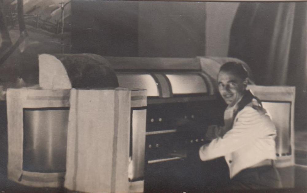Foto van een man in smoking achter een orgel met twe...