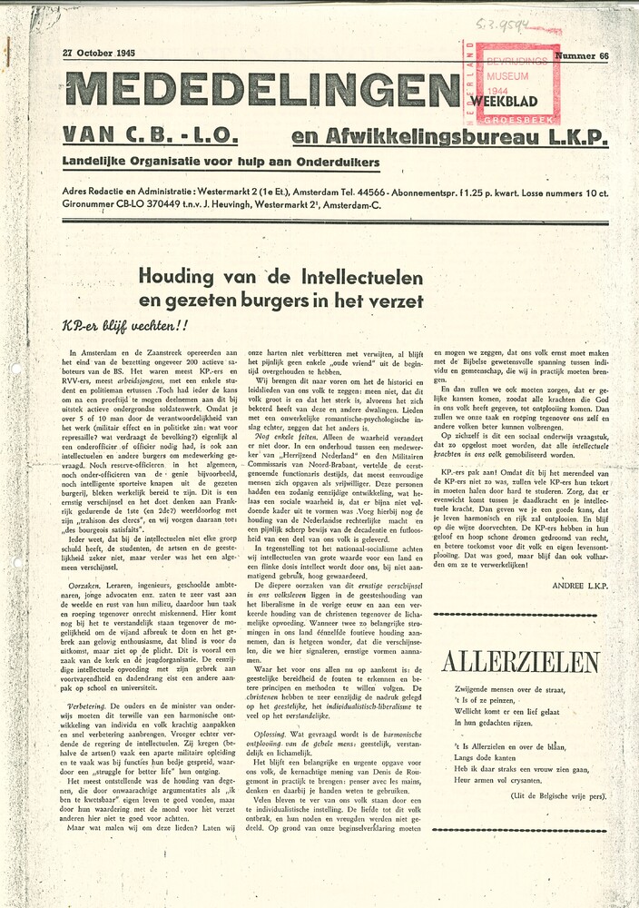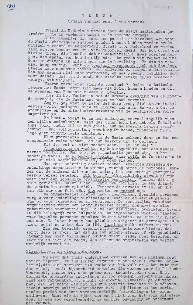 Verzet; orgaan van het Comité van Verzet.