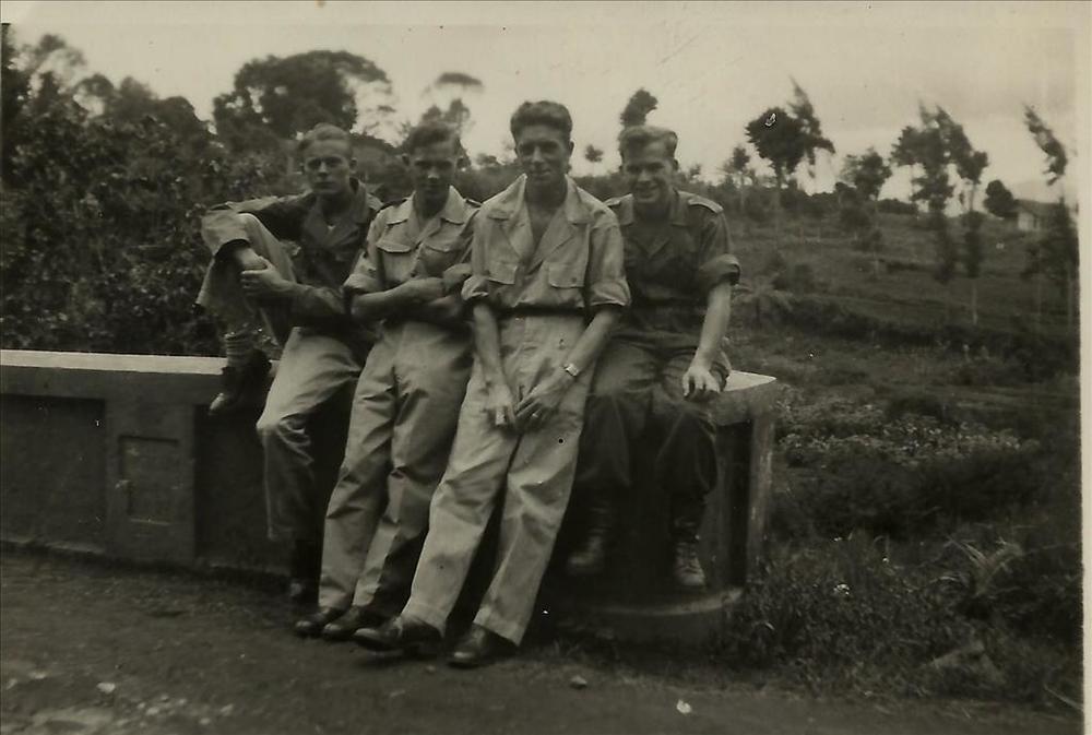 Nederlands Indië; lage muur, vier militairen, Jan Dr...