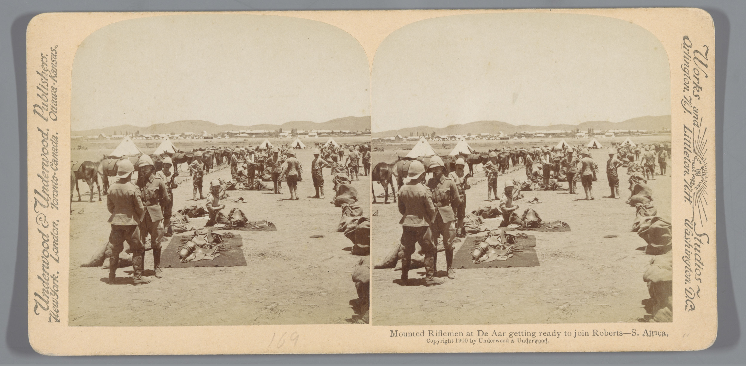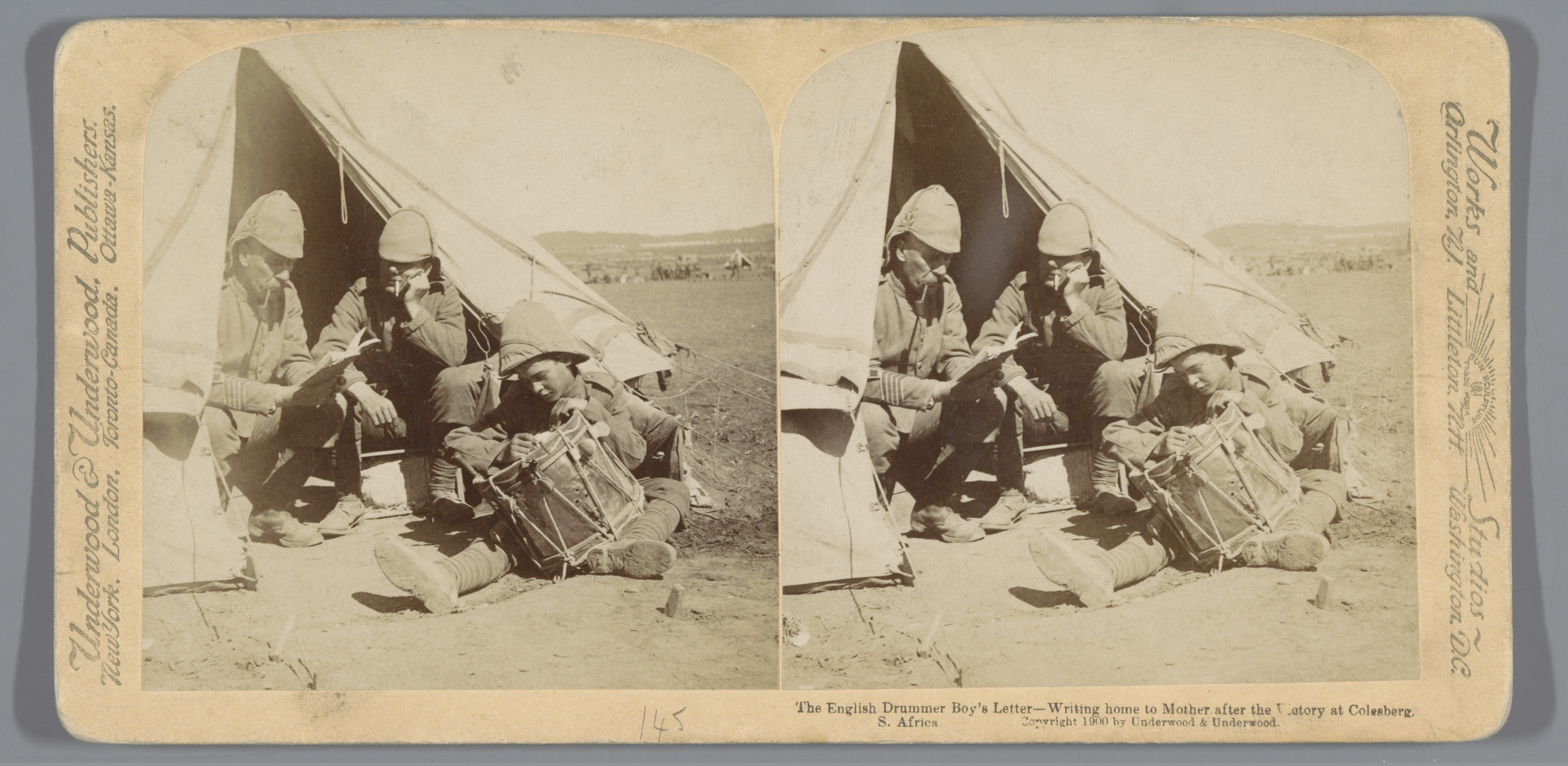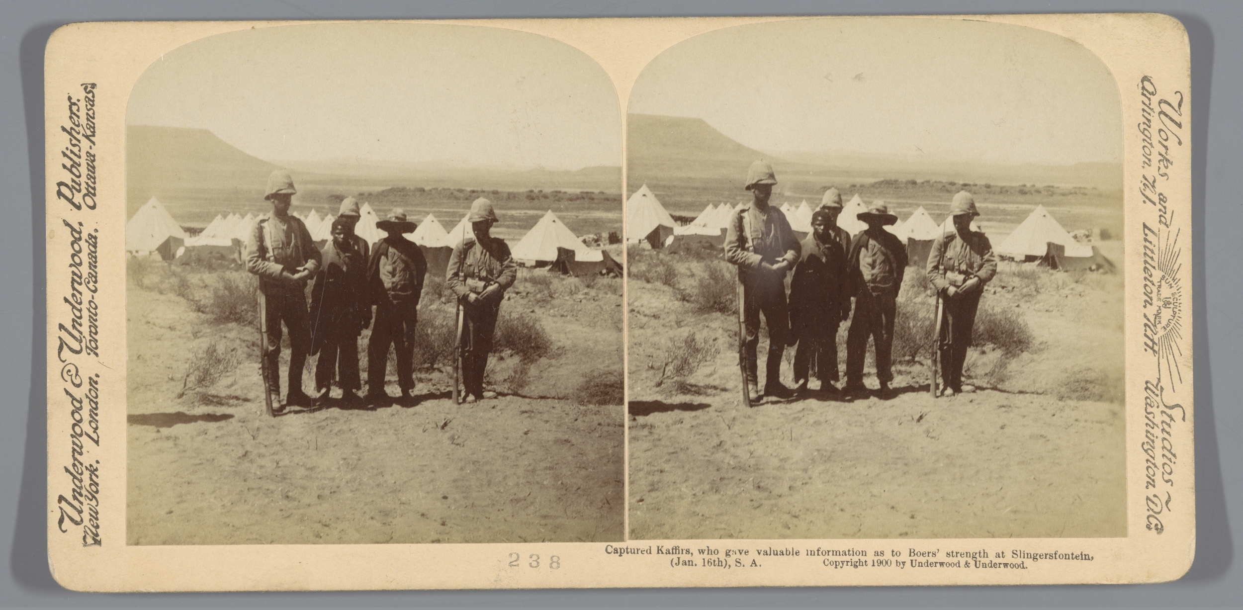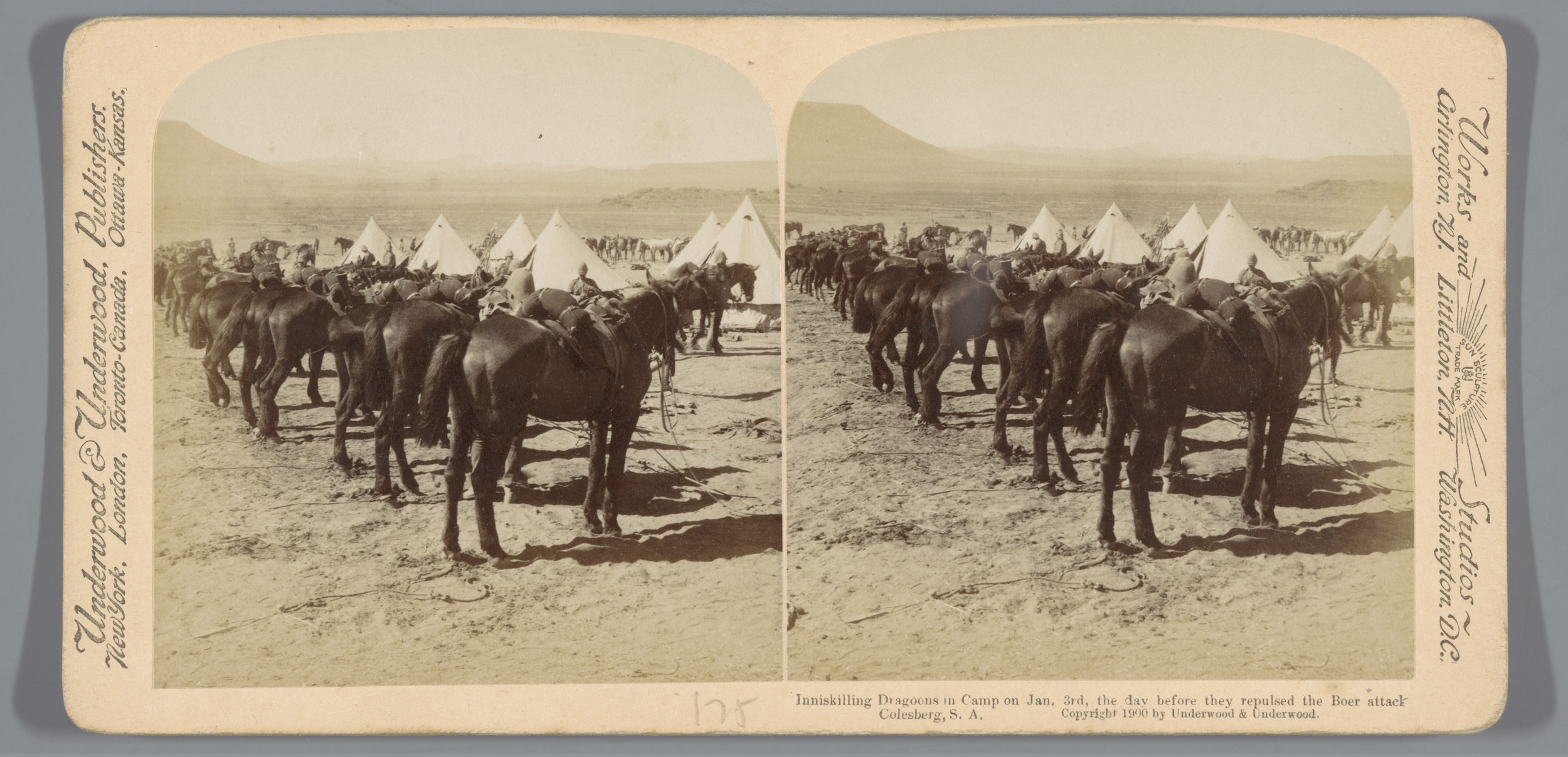 Drie soldaten voor een tent in Colesberg, Zuid-Afrika