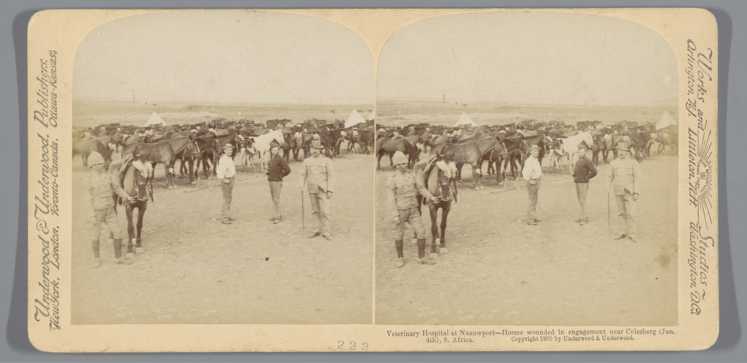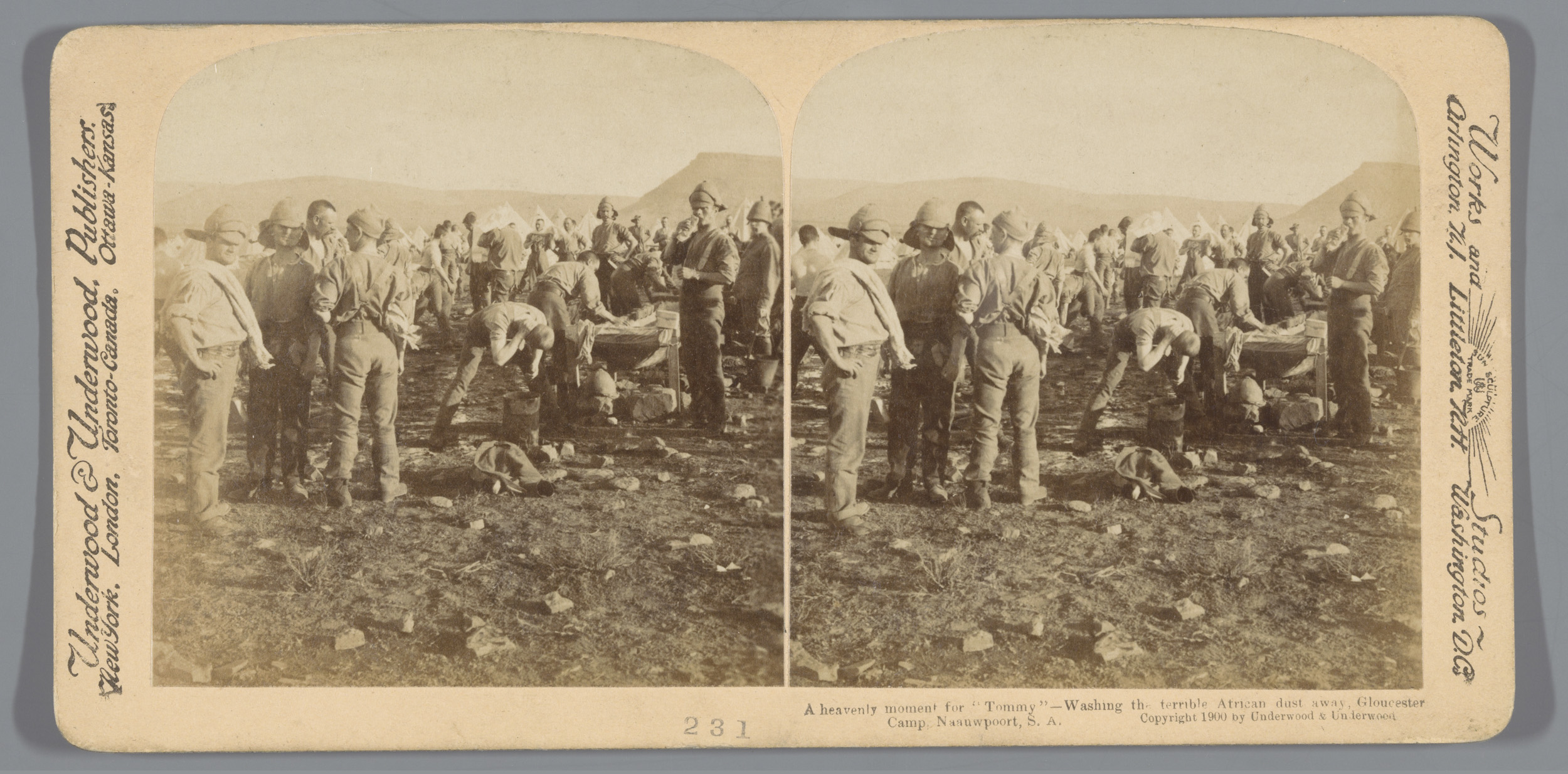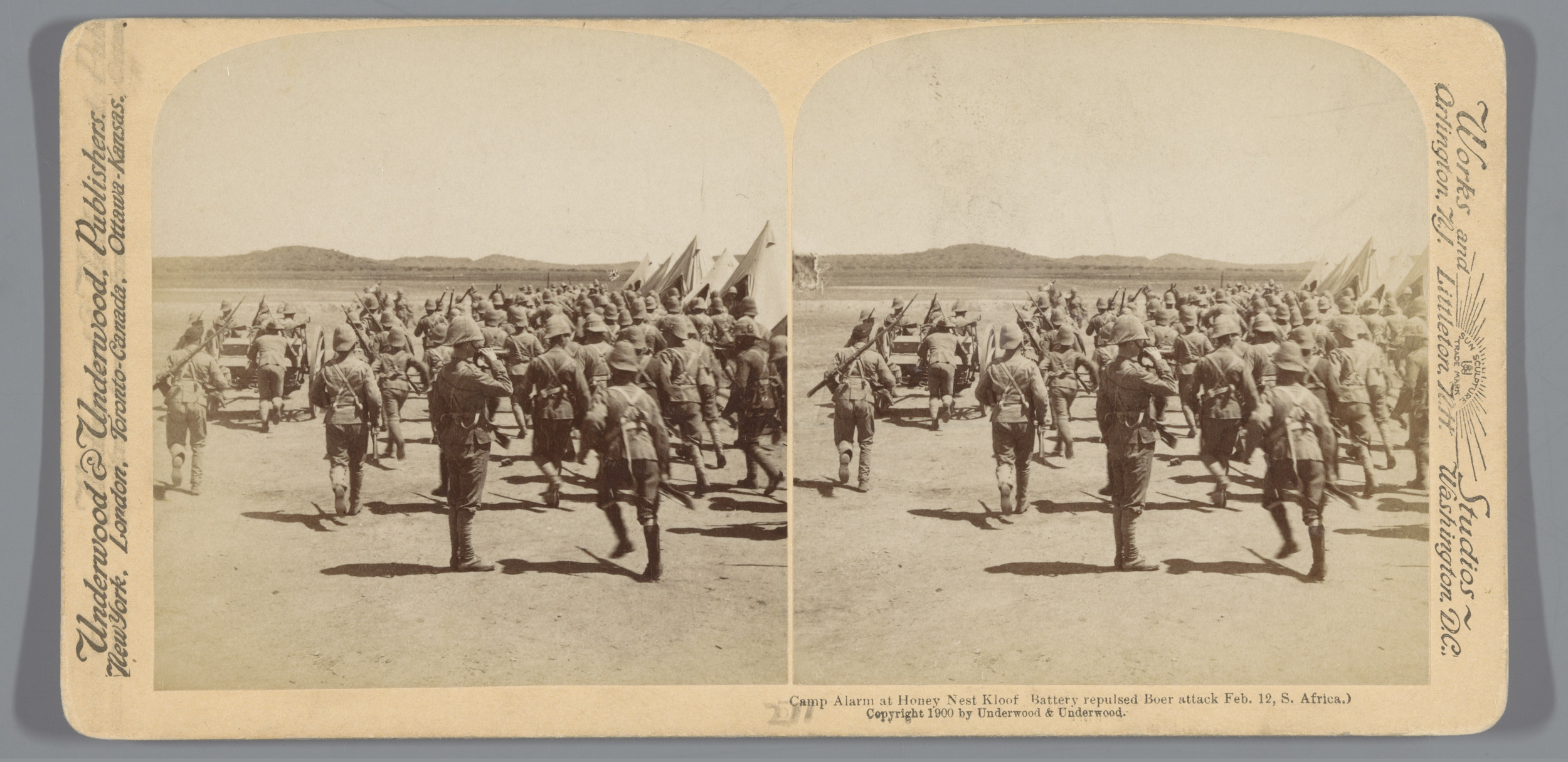 Drie soldaten voor een tent in Colesberg, Zuid-Afrika
