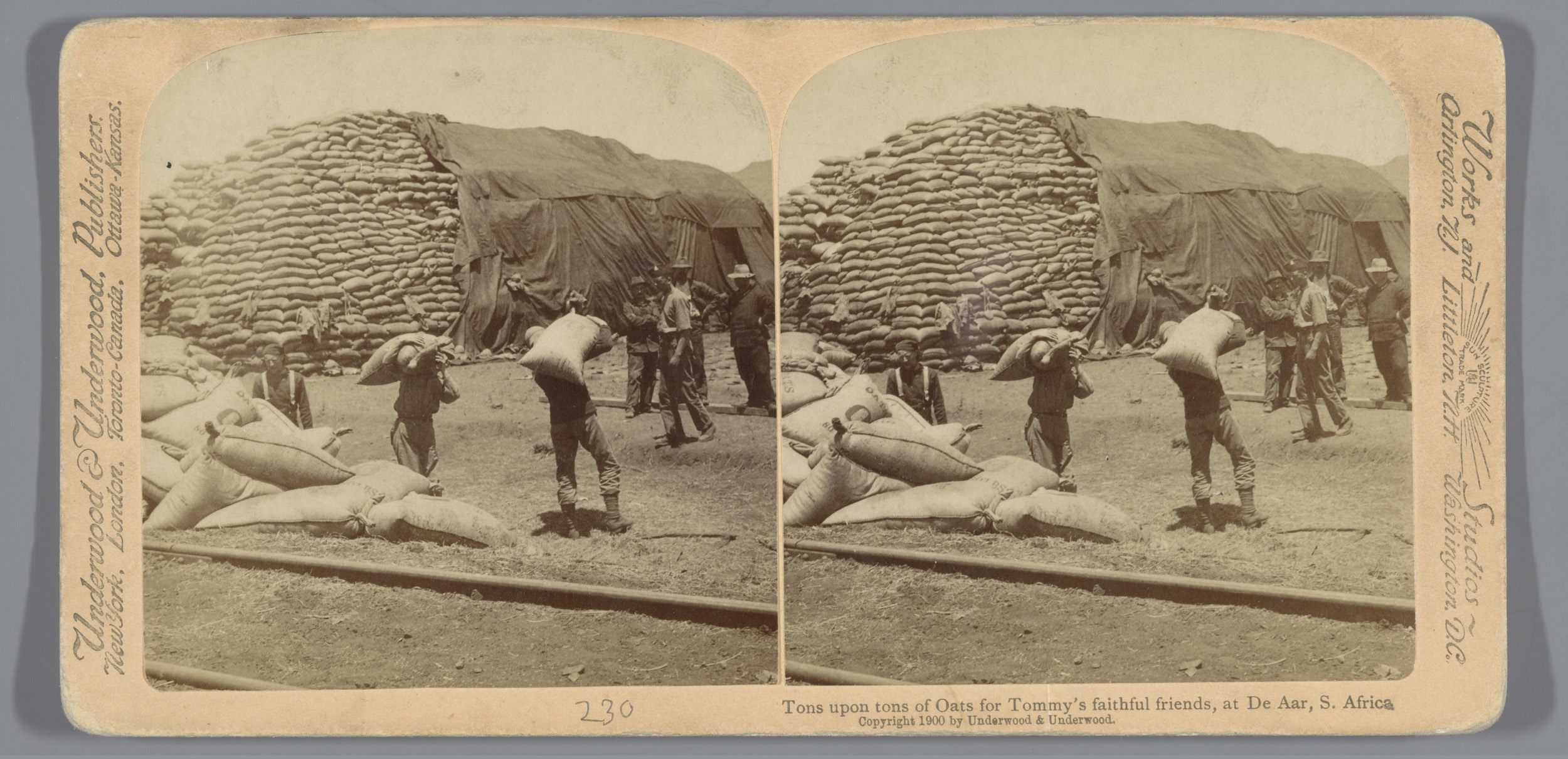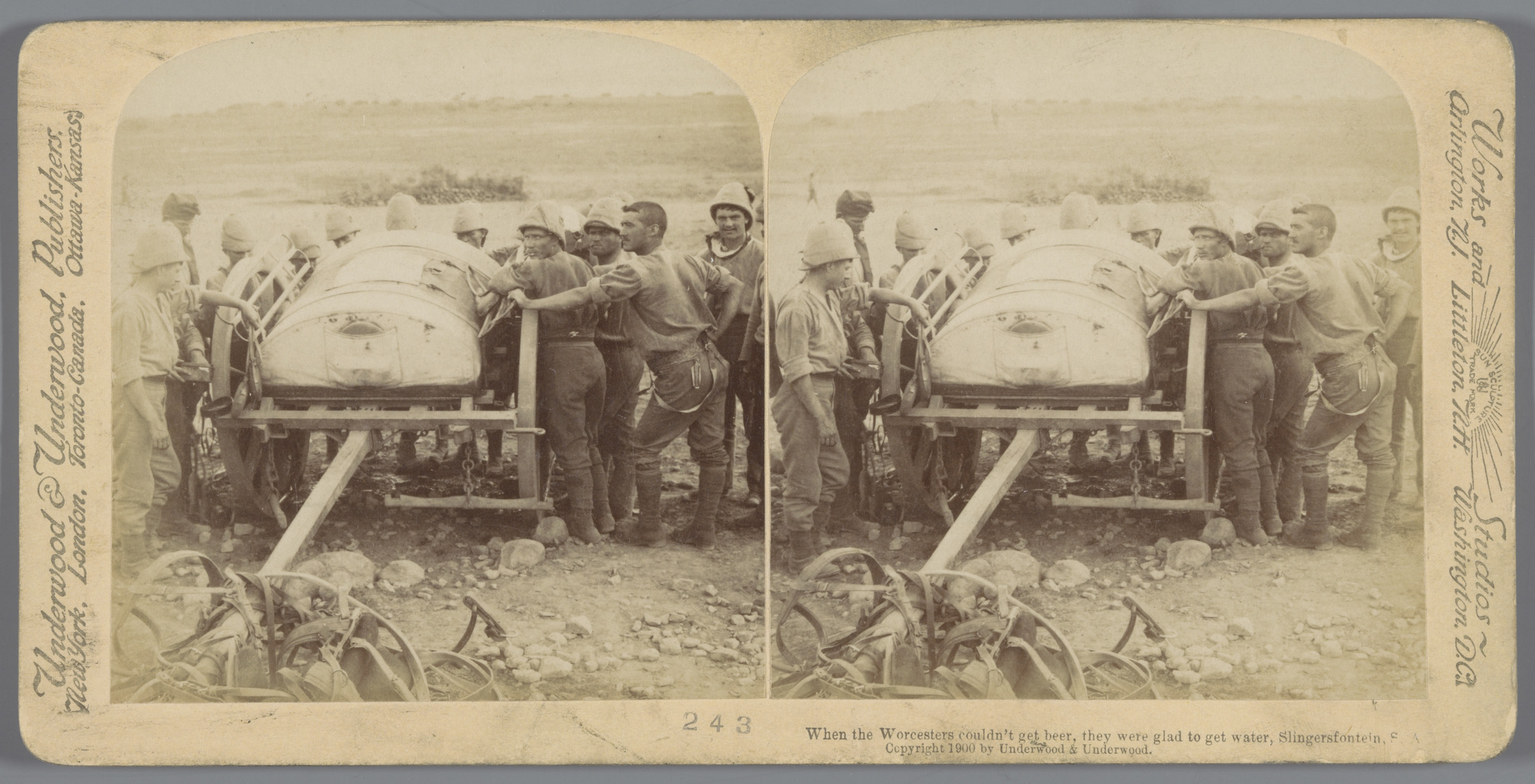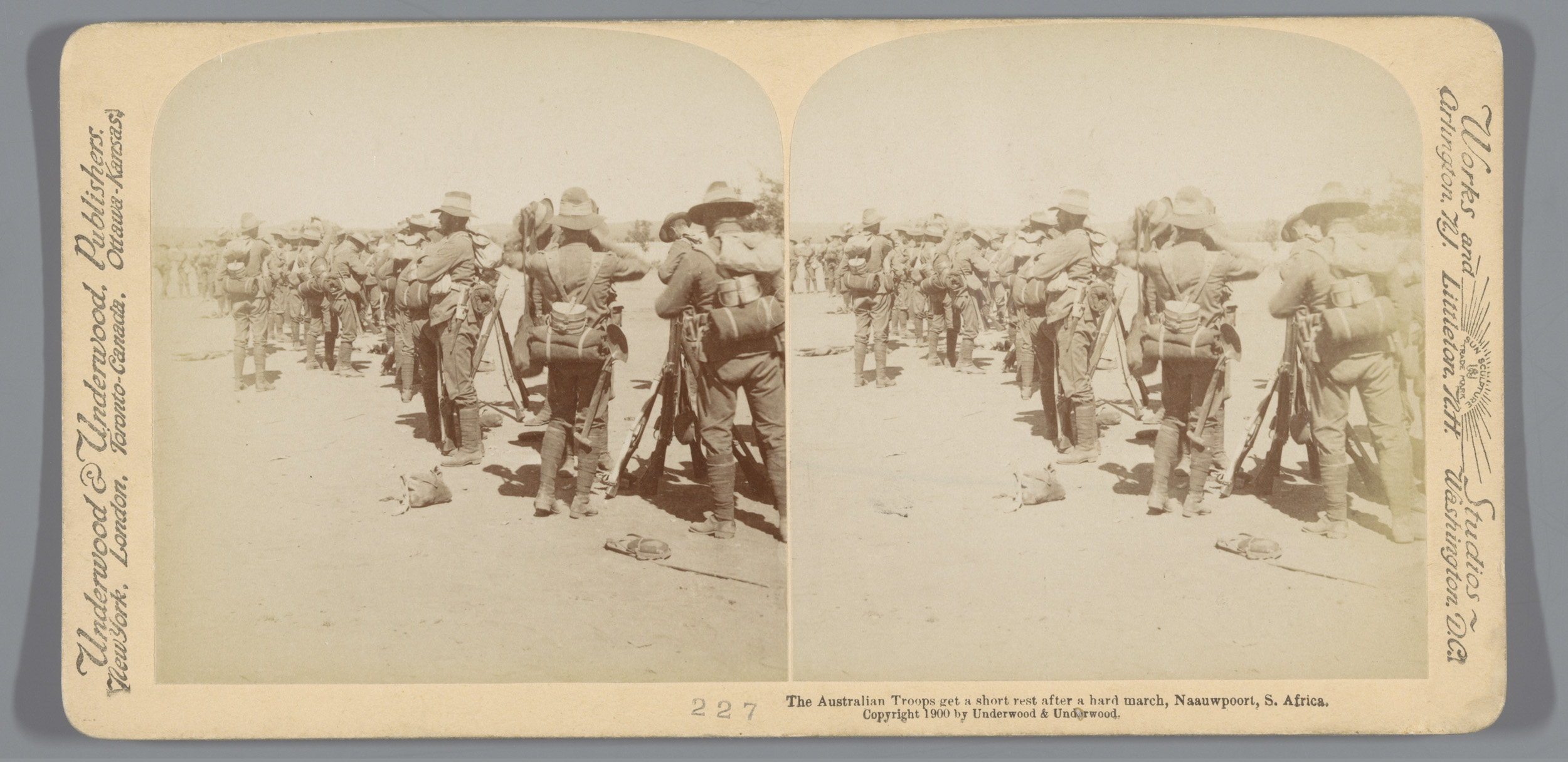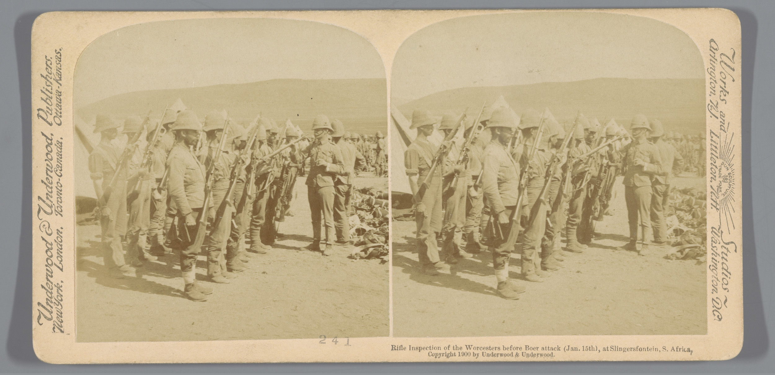 Drie soldaten voor een tent in Colesberg, Zuid-Afrika