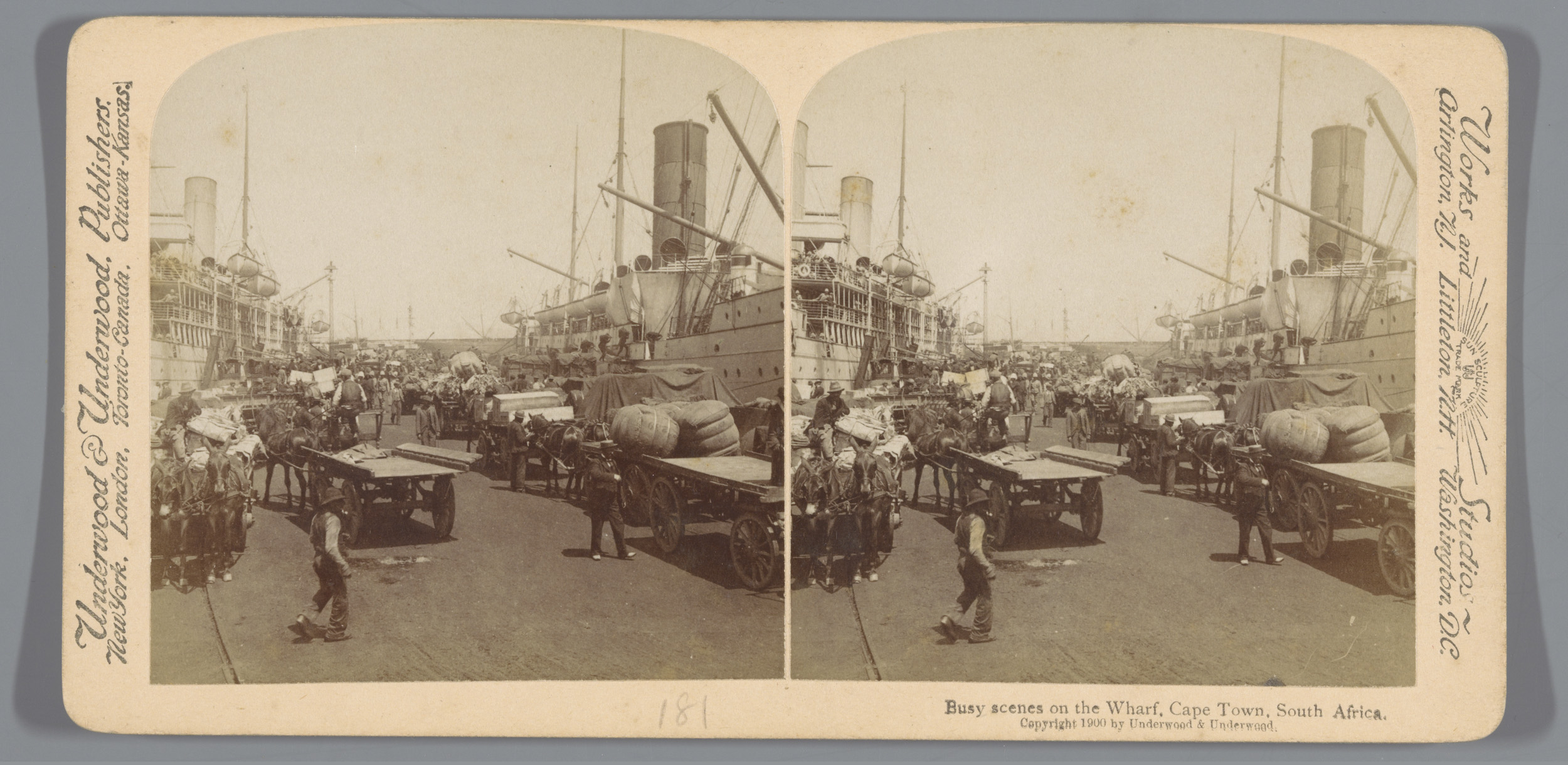 Kade met veel mensen en paardenwagens in Kaapstad