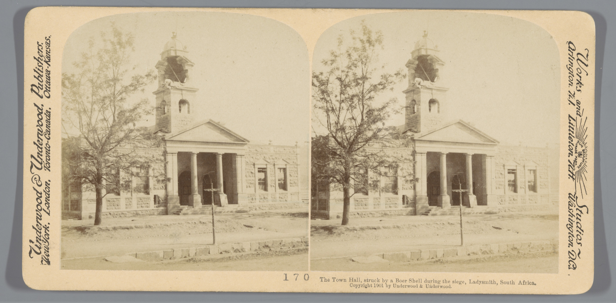 Gezicht op het stadhuis van Ladysmith dat is beschad...