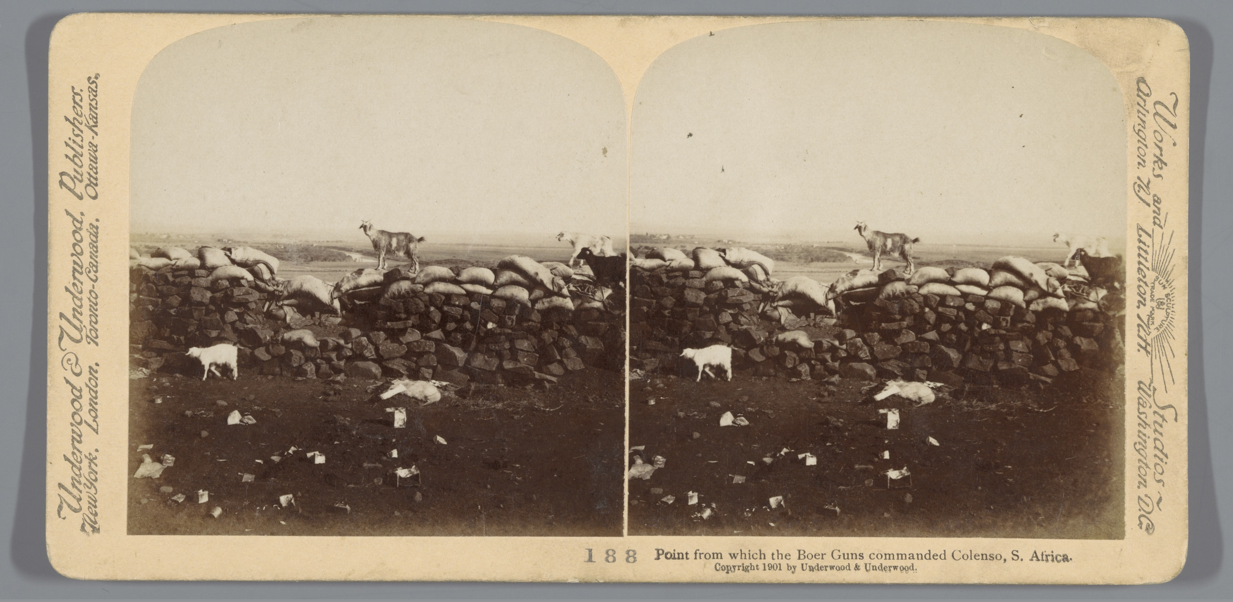 Gezicht op een muur met zandzakken en geiten, vanaf ...