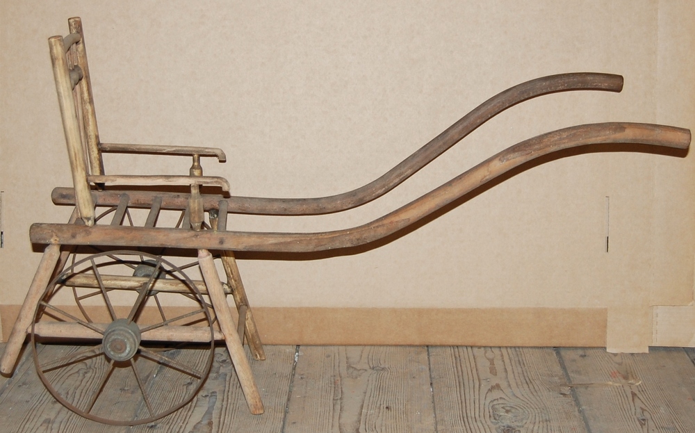 speelgoedwagen. Lang gebogen houten duwarmen, spijlp...