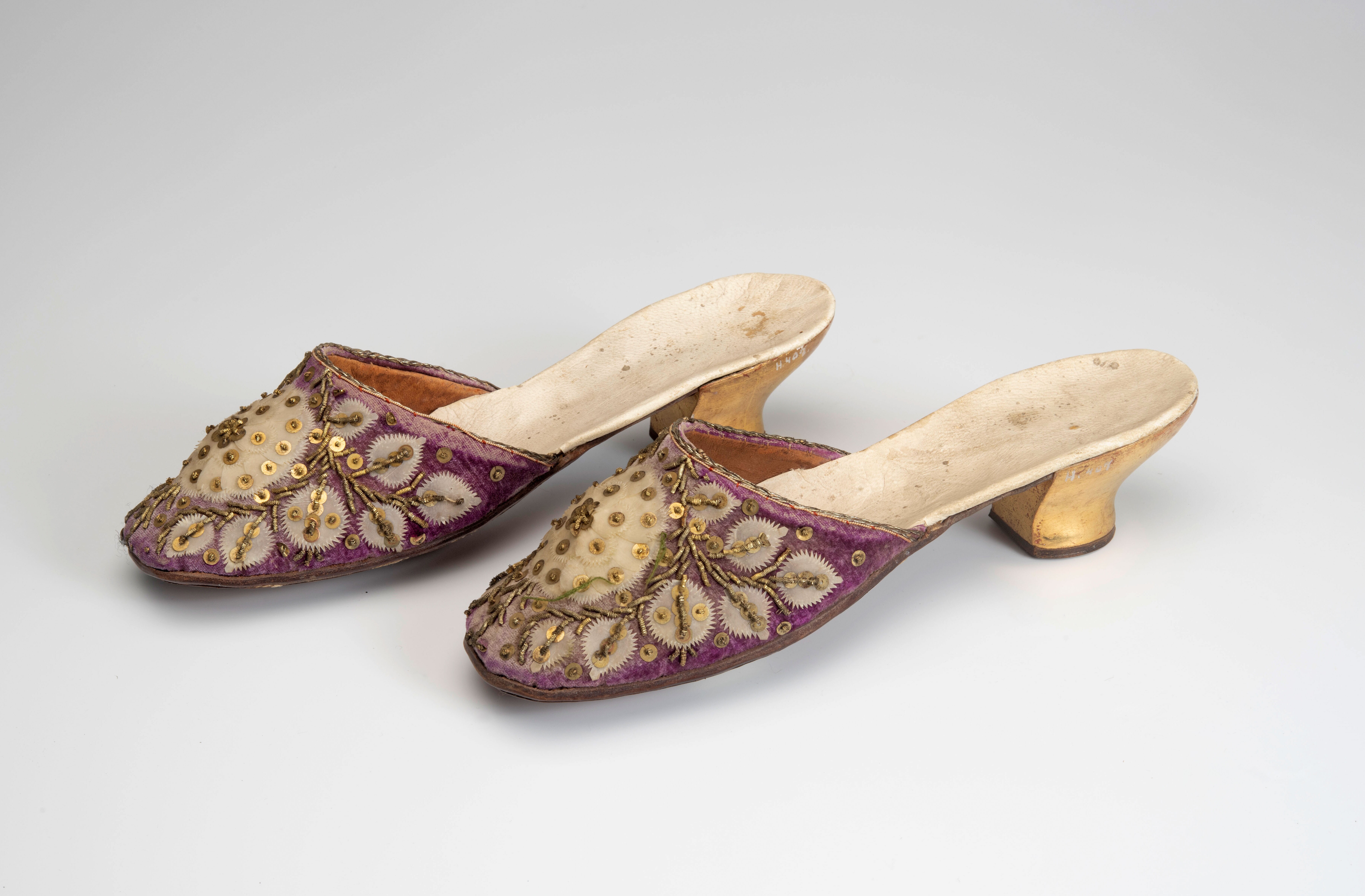 Een paar muiltjes met vergulde hak van paars fluweel...