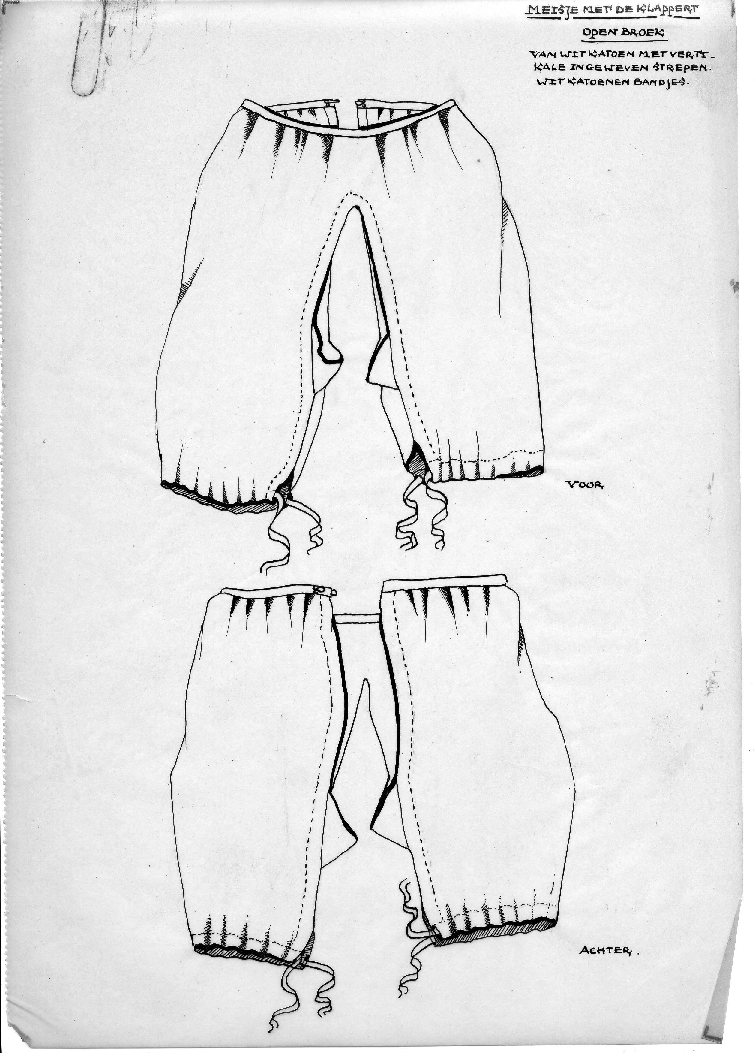 Tekening van open broek voor meisje met de klappert,...