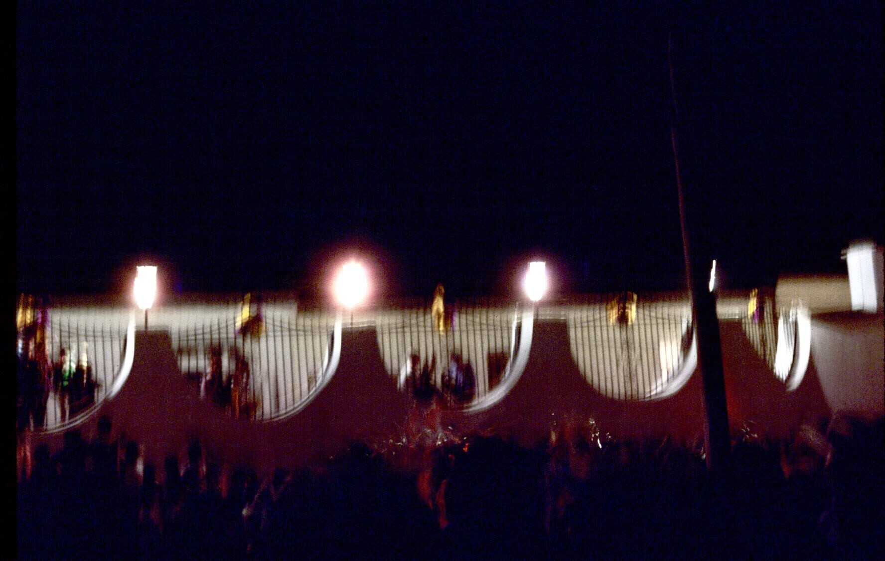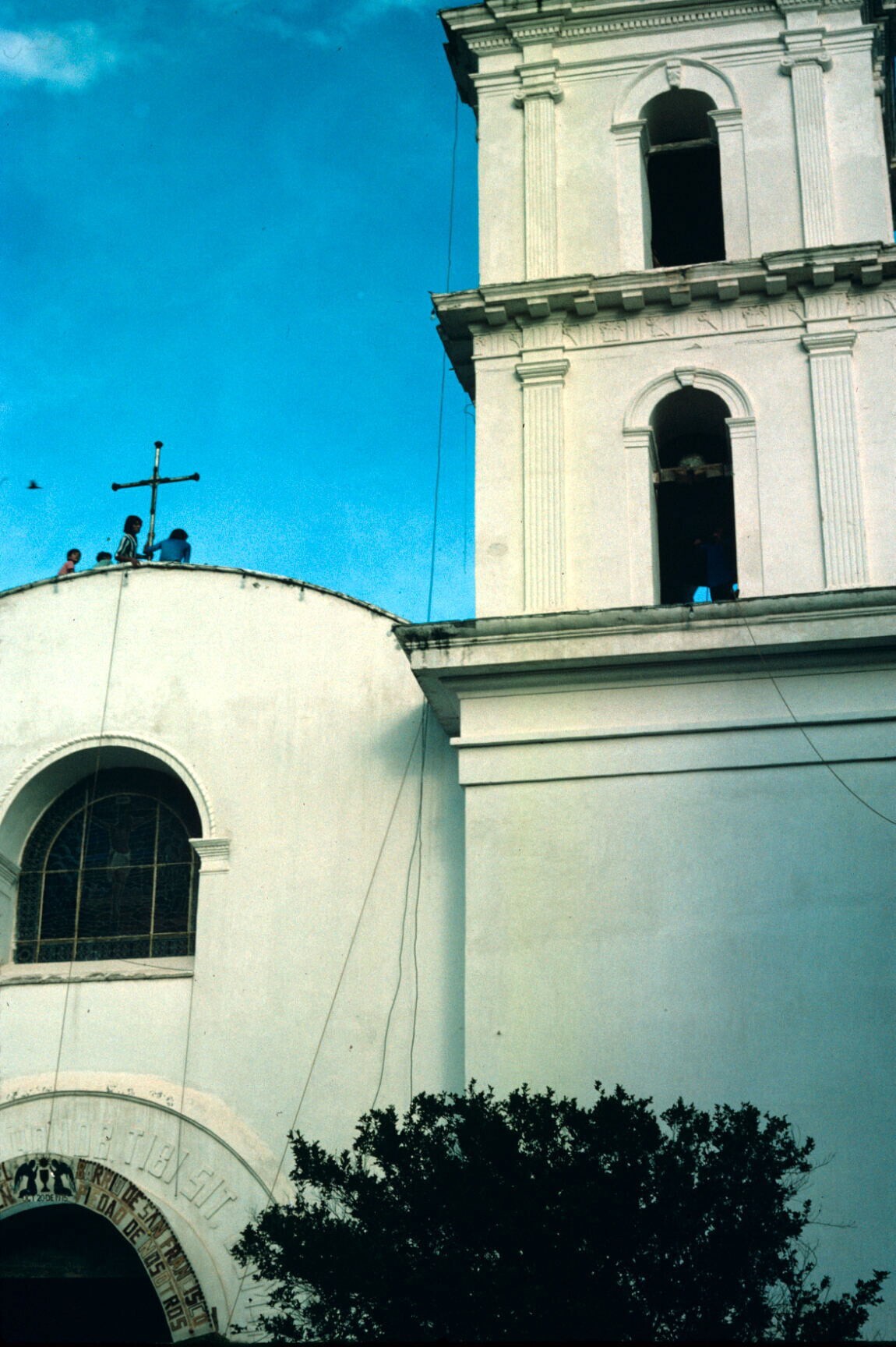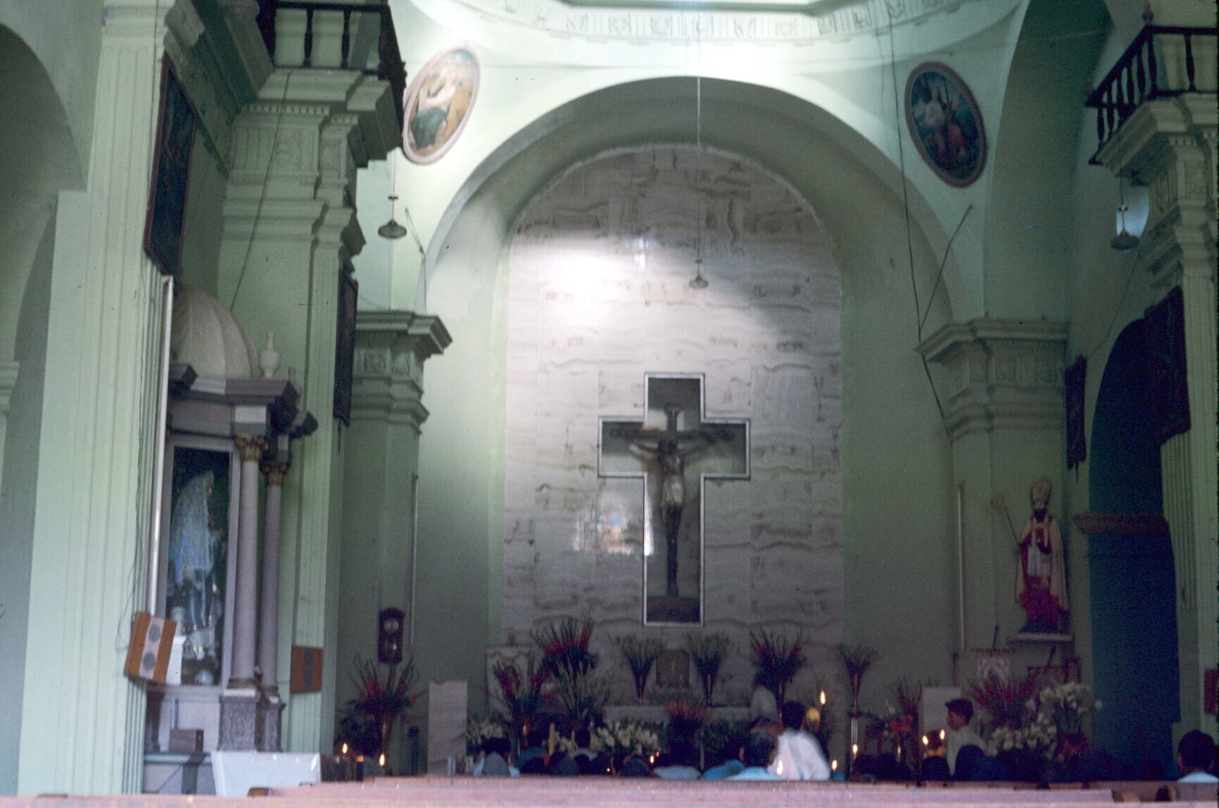 ingangshek in kerkmuur (spandoek heet pelgrims welkom)