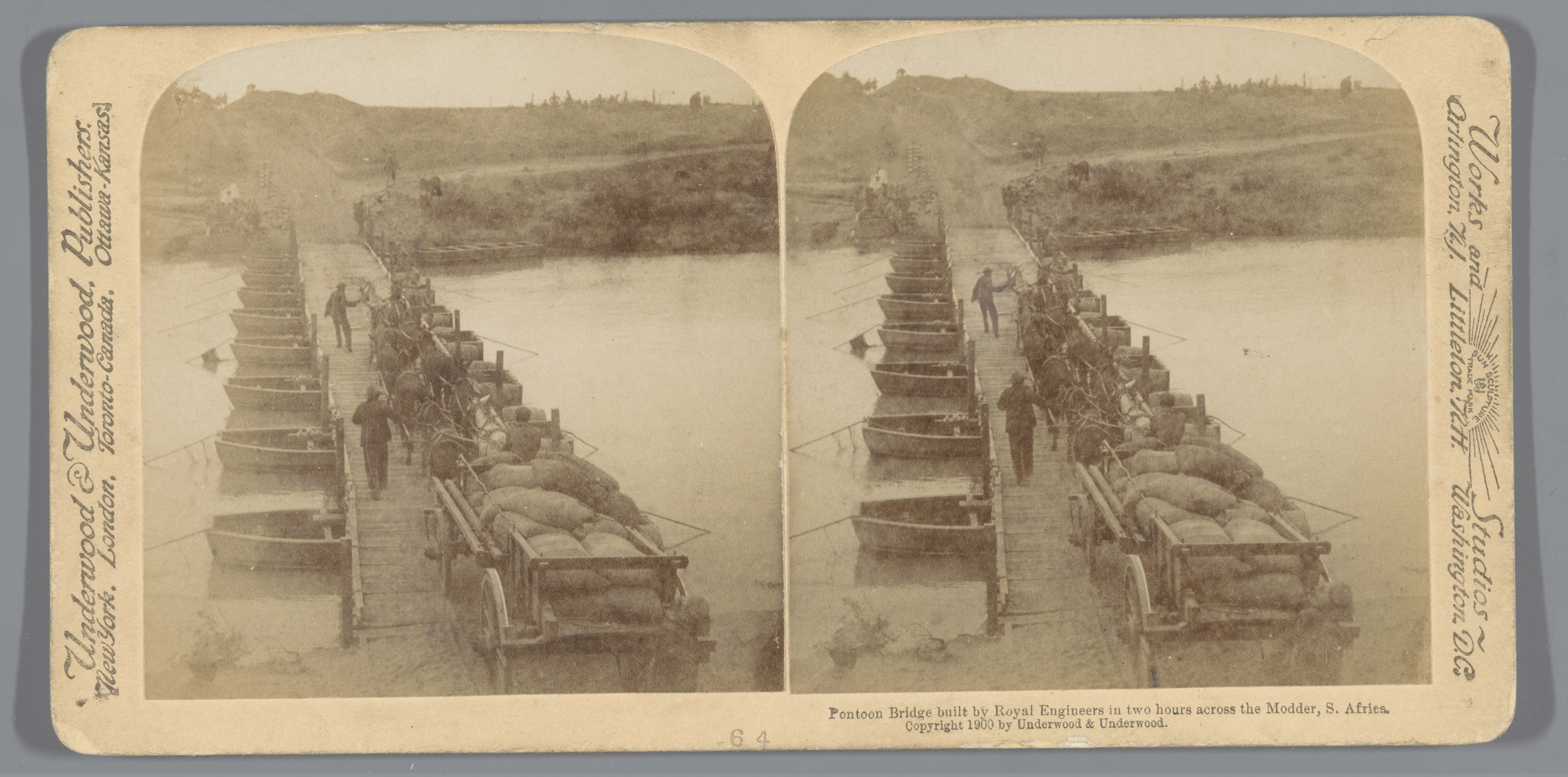 Gezicht op een pontonbrug over de Modderrivier in Zu...