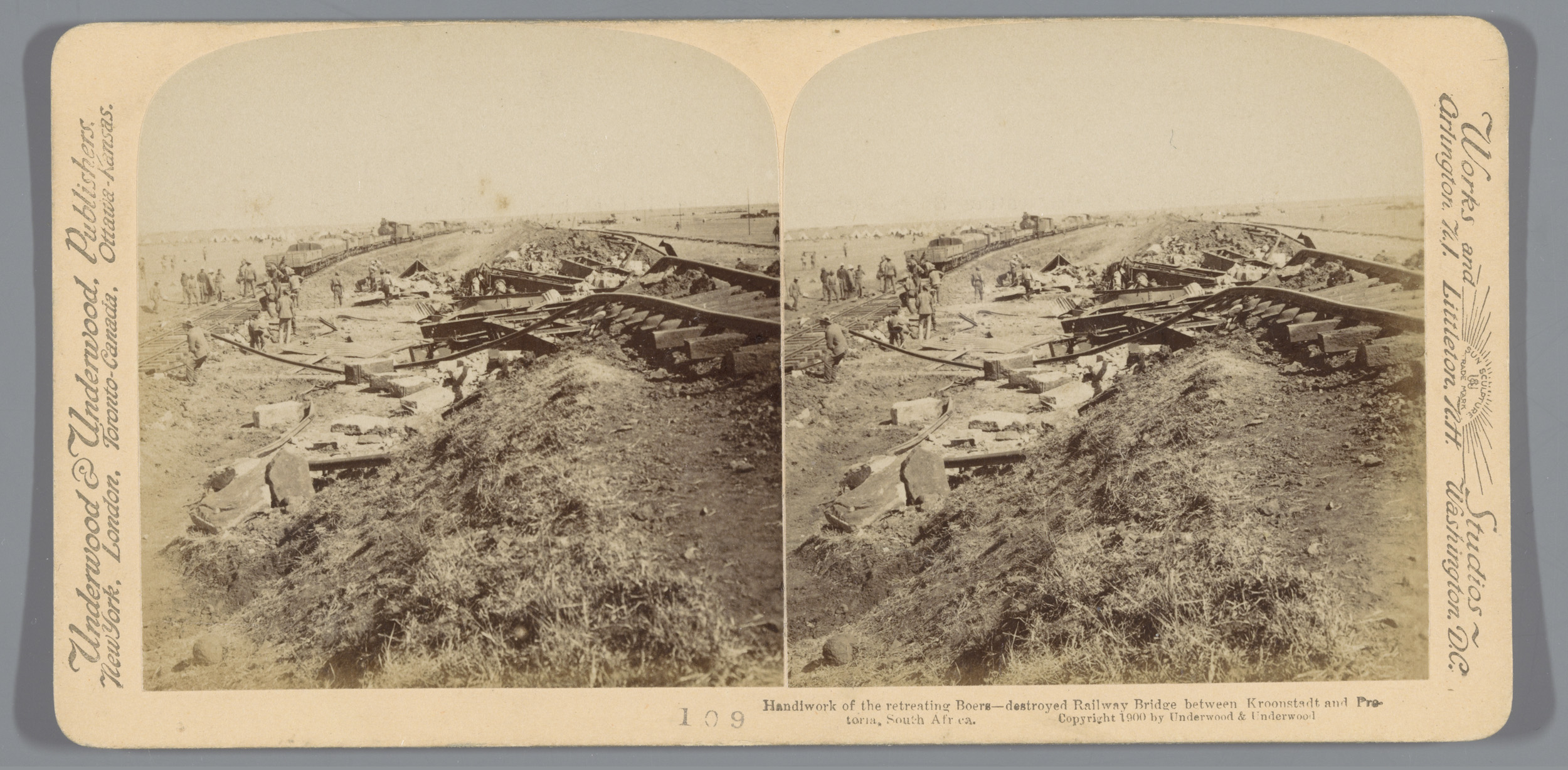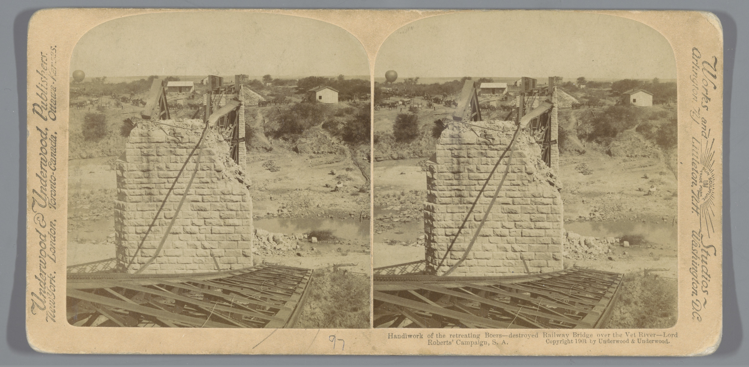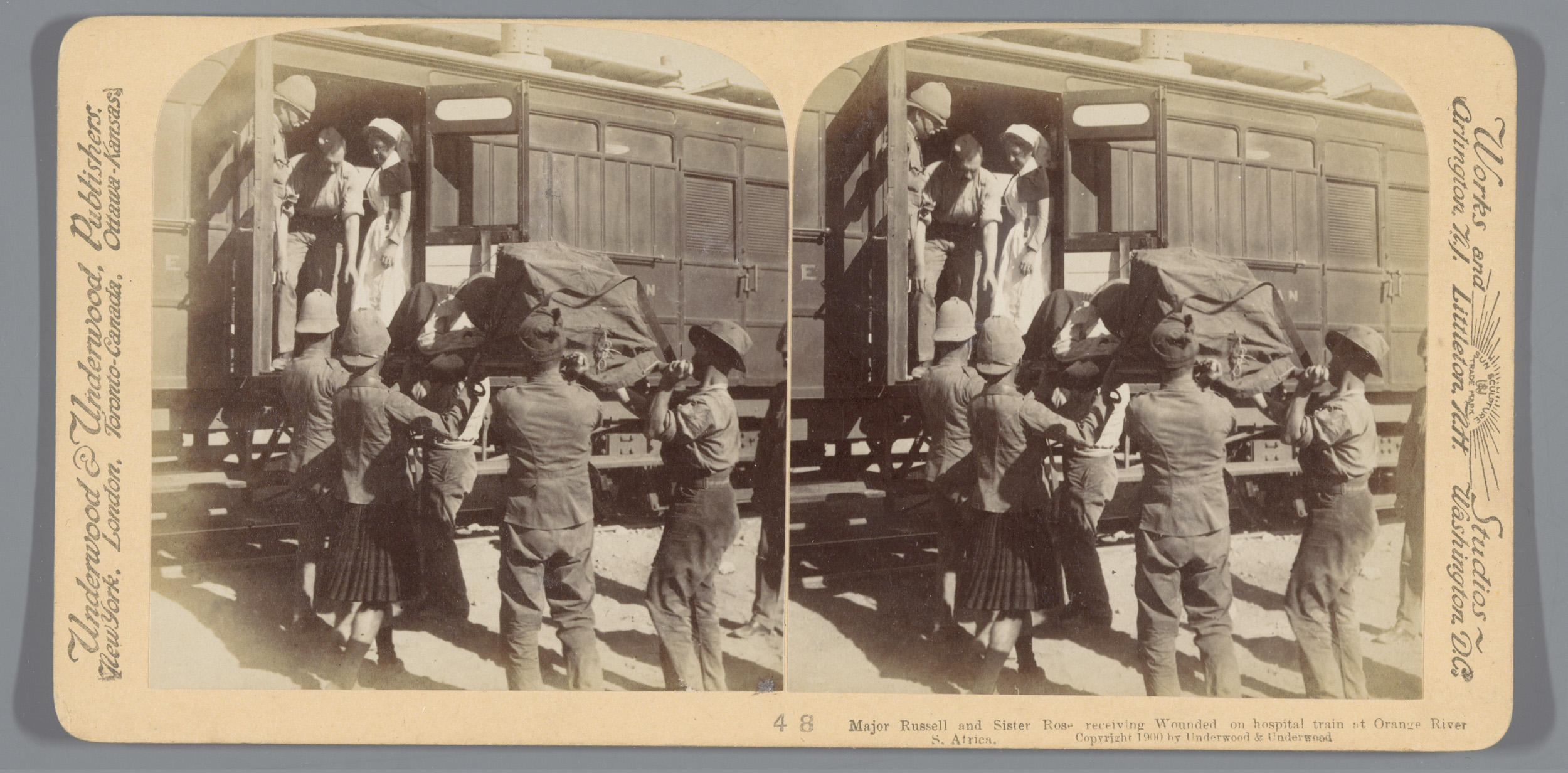 Treinwagon met gewonde soldaten bij de Oranjerivier,...