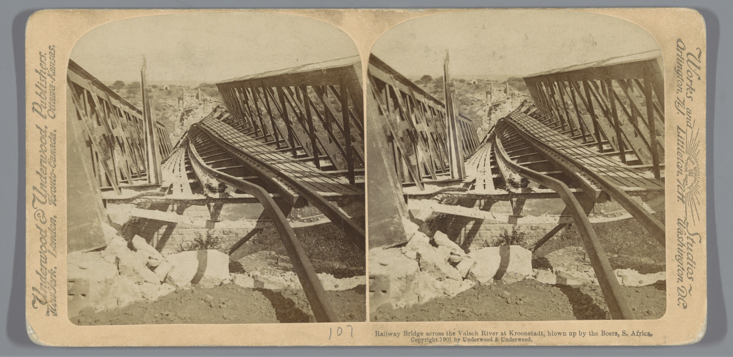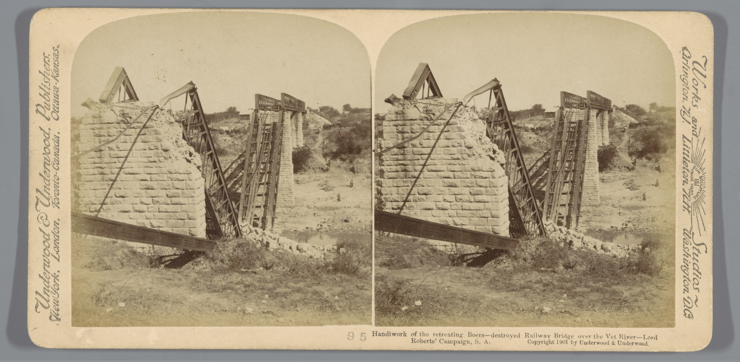 Gezicht op een opgeblazen brug over de Valsrivier bi...