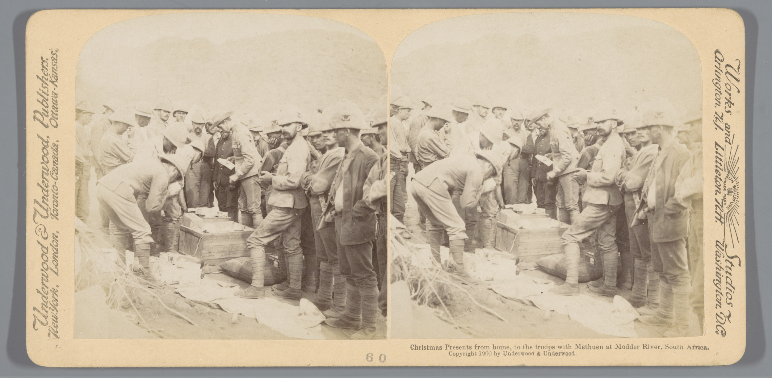 Voorstelling van soldaten die kerstcadeaus van thuis...