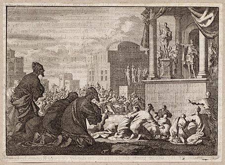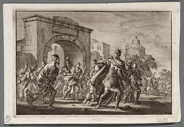 Koning Agrippa wordt door de Joden met steenworpen u...