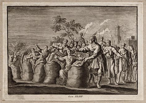 Jozefs broers knielen voor hem en bieden geschenken aan