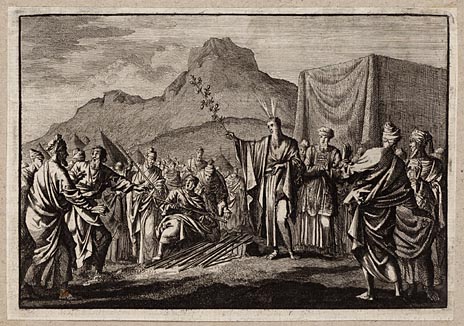 Voor de tabernakel laten Mozes en Aäron de verzameld...