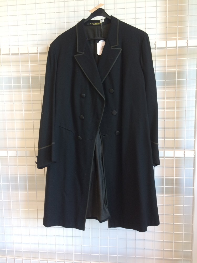 Lange zwarte geklede mannenjas van laken, omboord me...