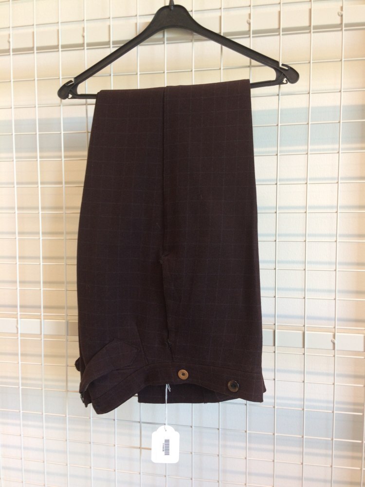 Lange colbertjas van donkerrode wol met grijs ruitpa...
