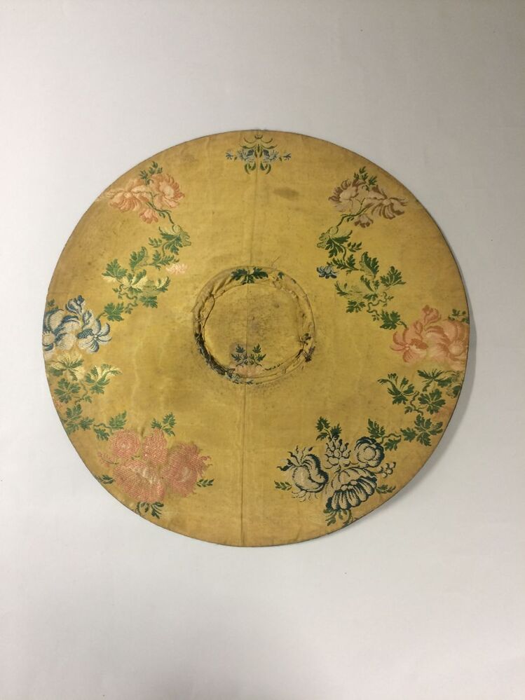 Platte hoed gevoerd met geel zijden damast met groot...