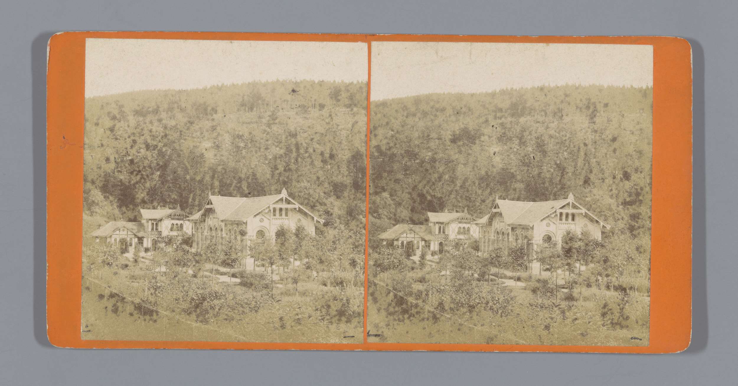 Enkele gebouwen tussen beboste heuvels, mogelijk Oos...