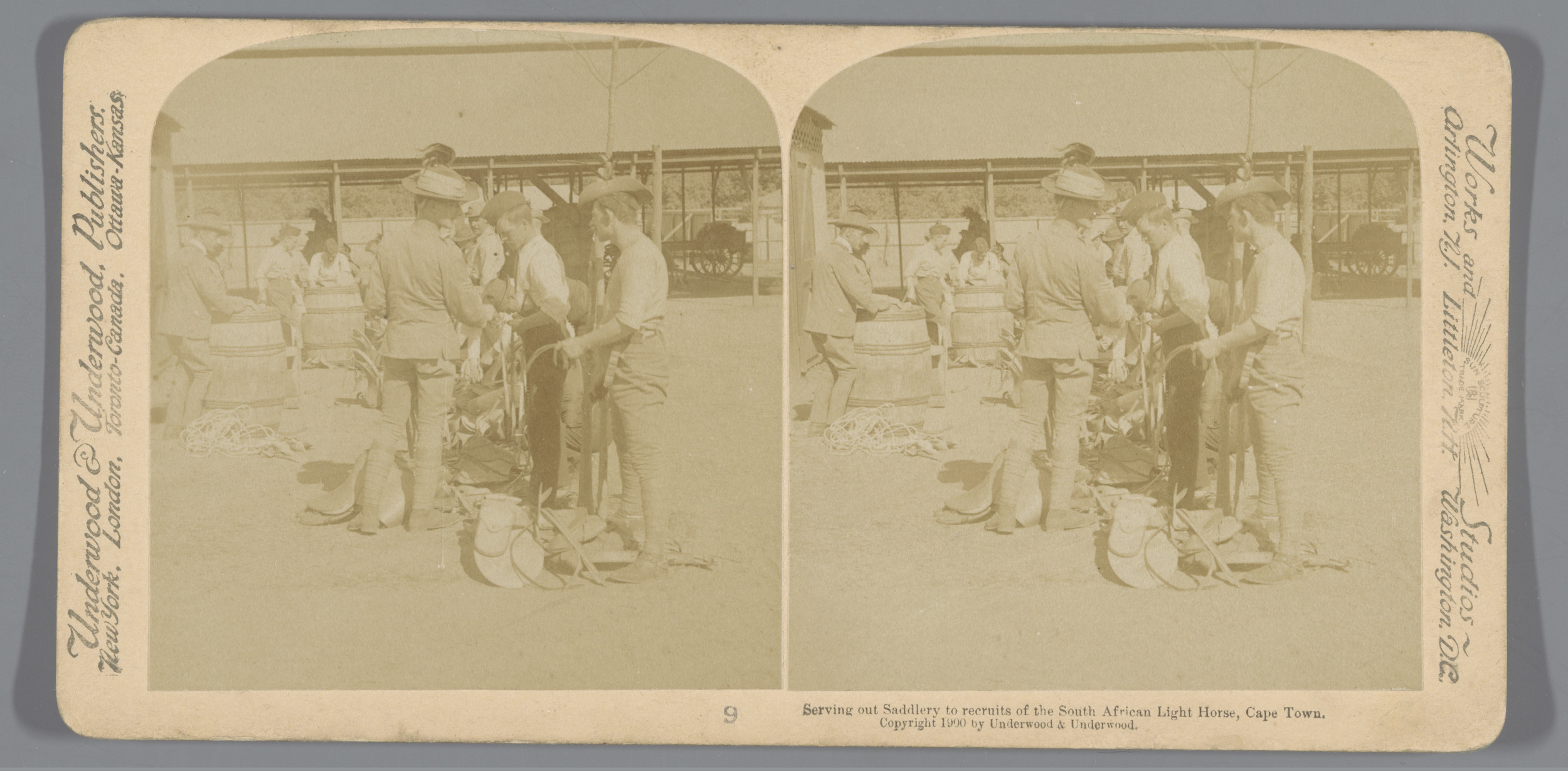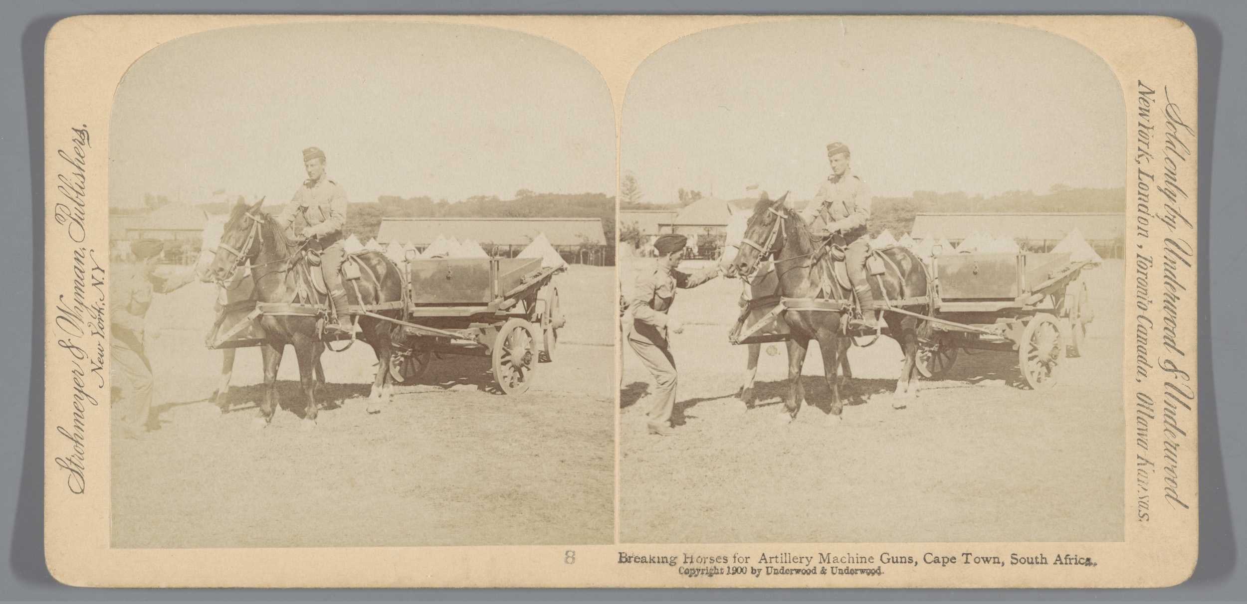 Het trainen van paarden voor artillerievuur in Kaaps...