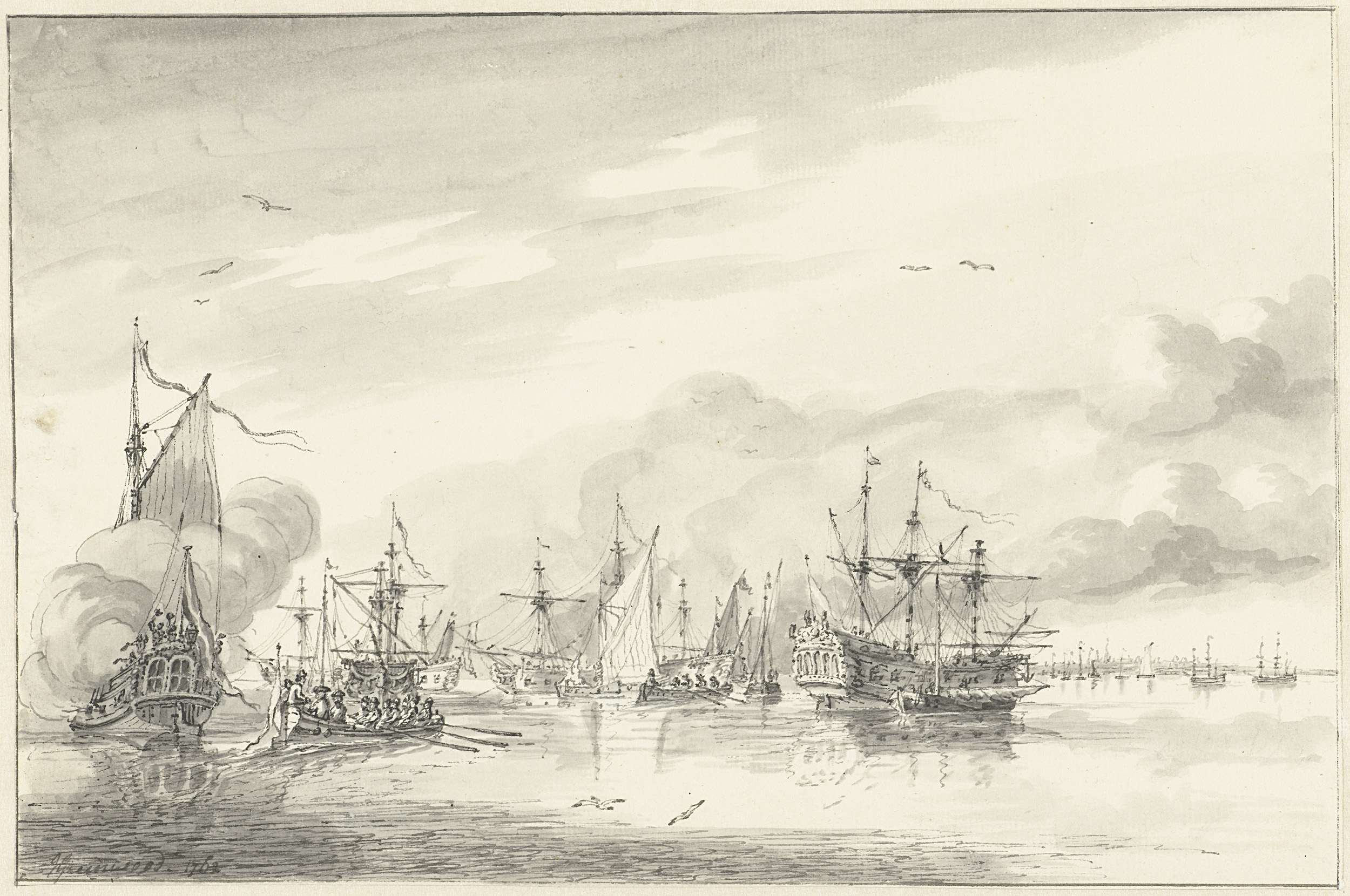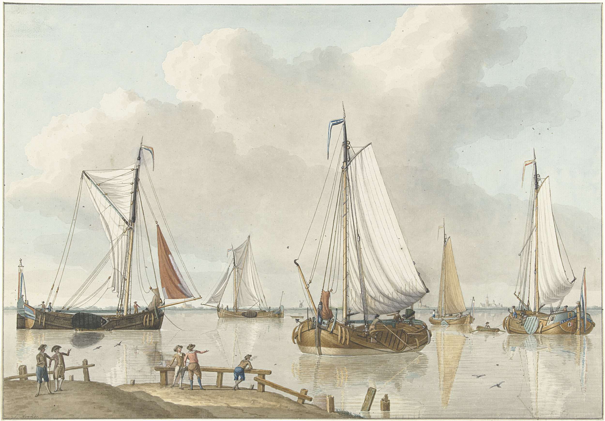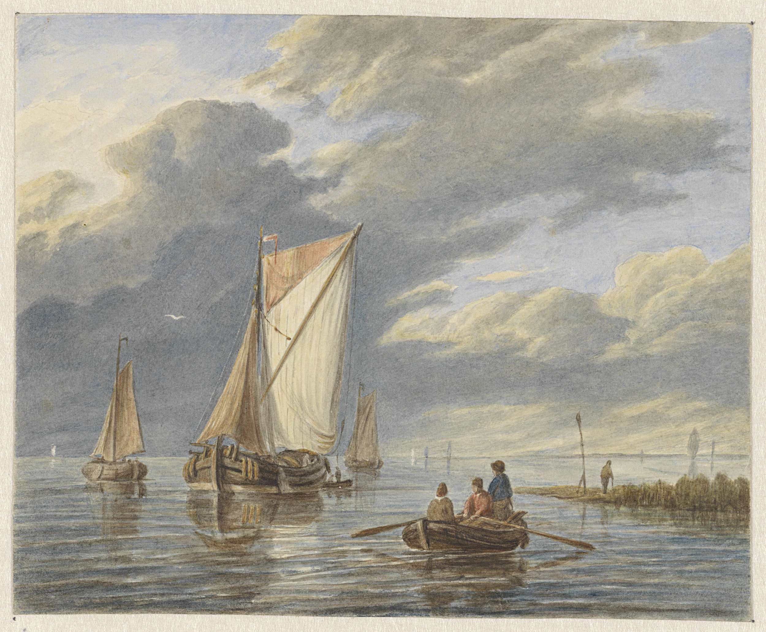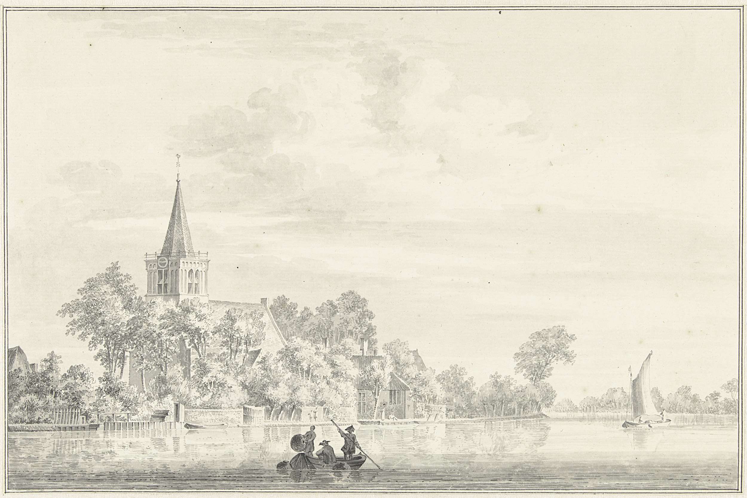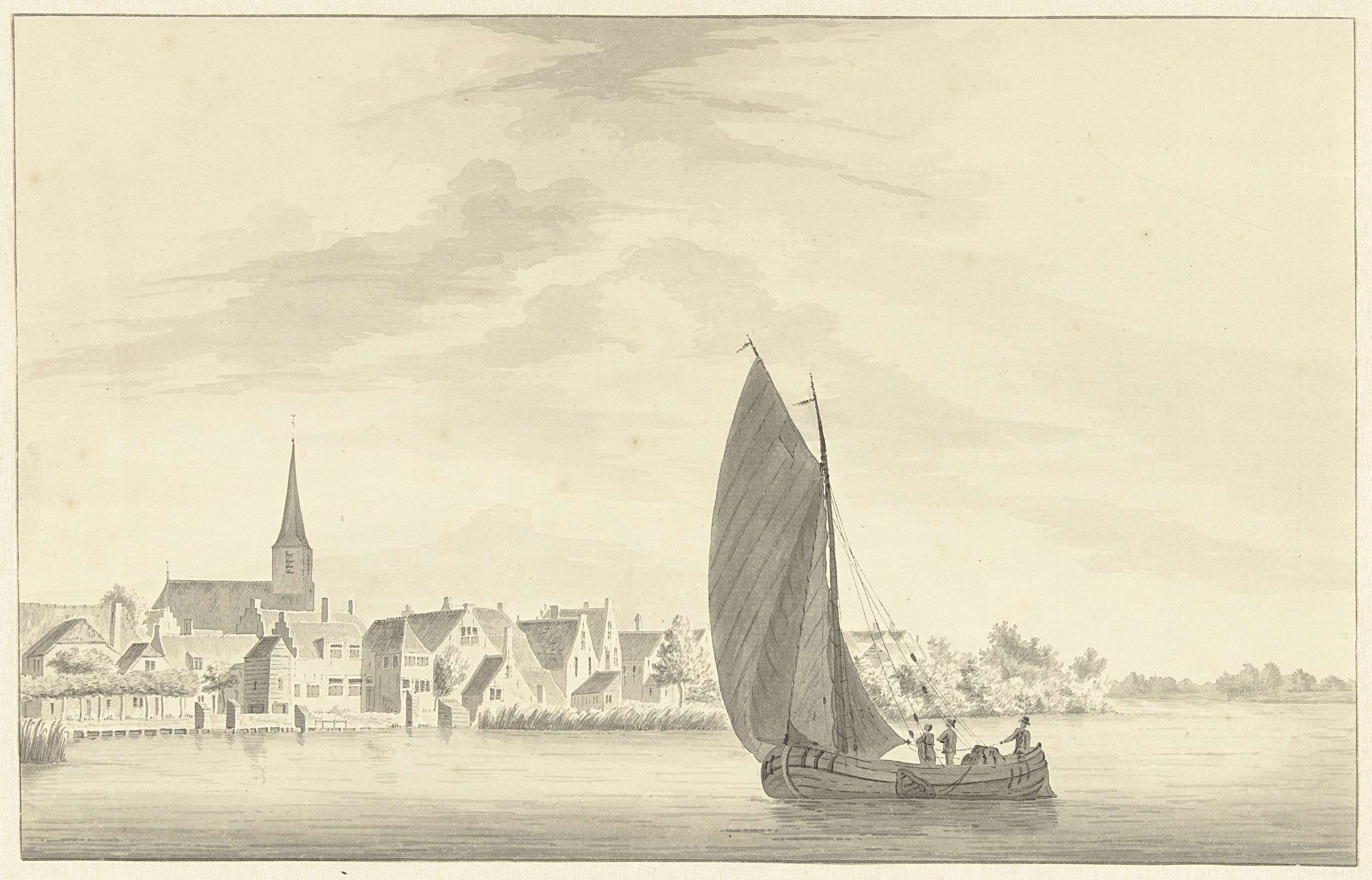 Het dorp Gouderak met op de voorgrond een zeilend schip