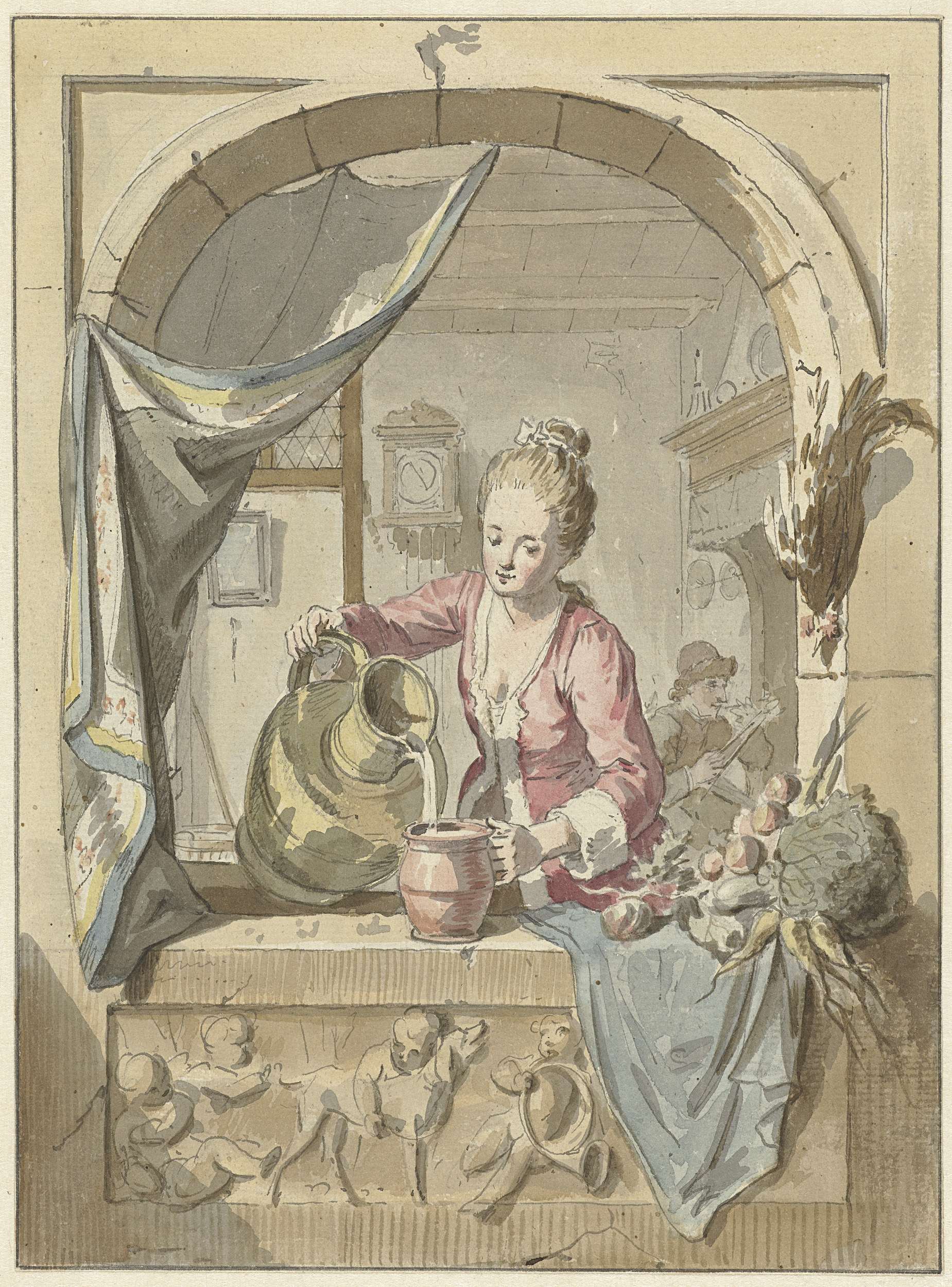 Vrouw schenkt melk uit een kan, in een venster