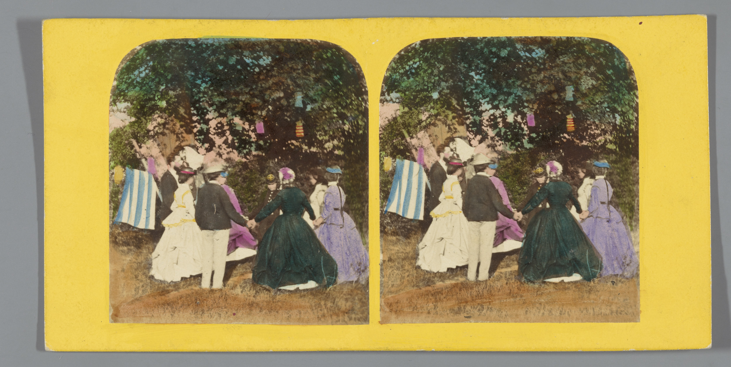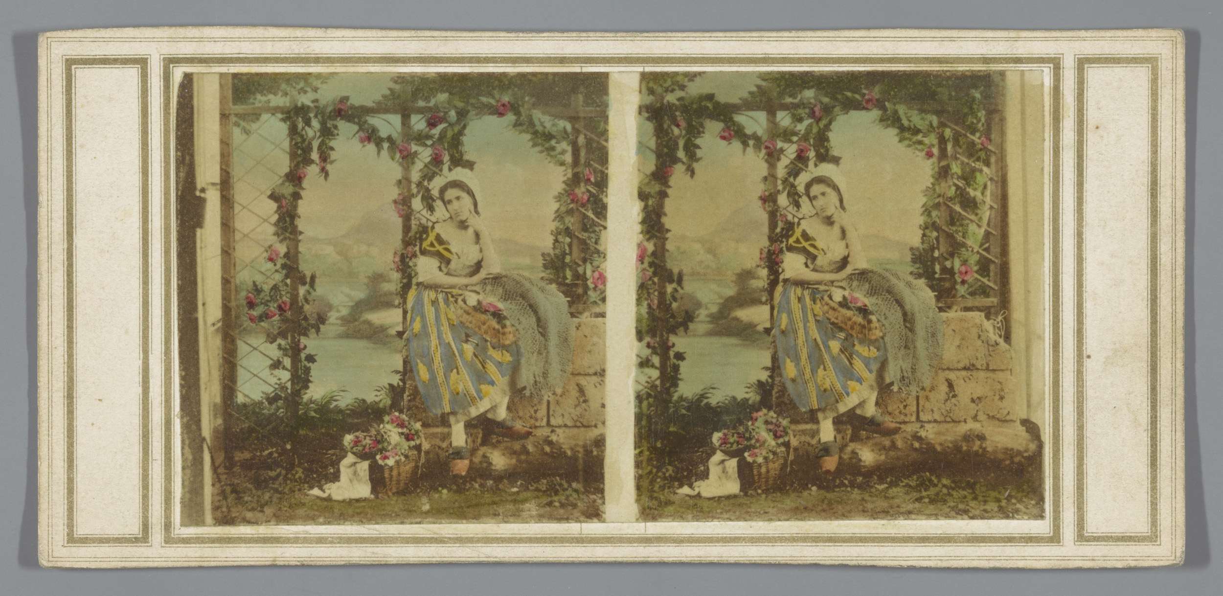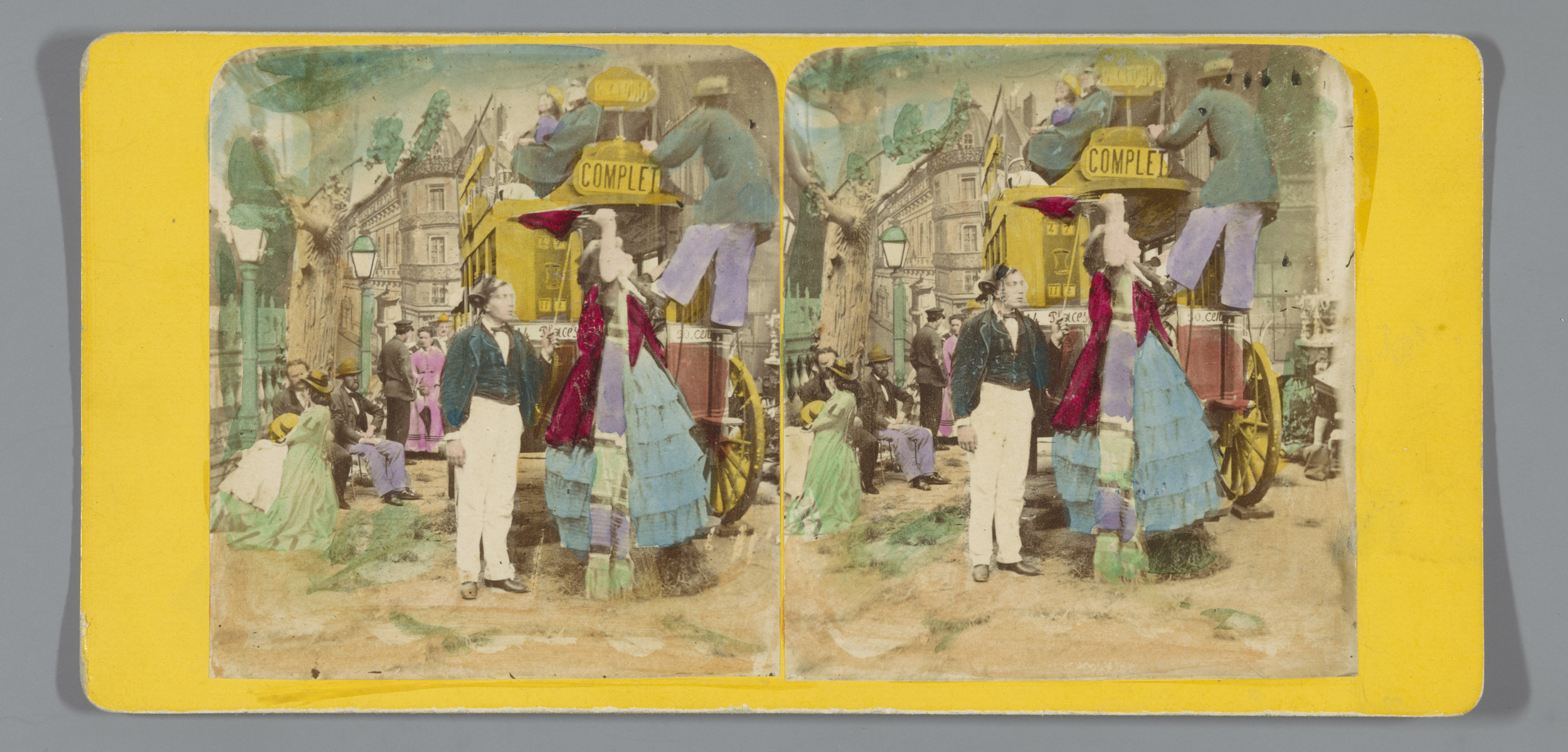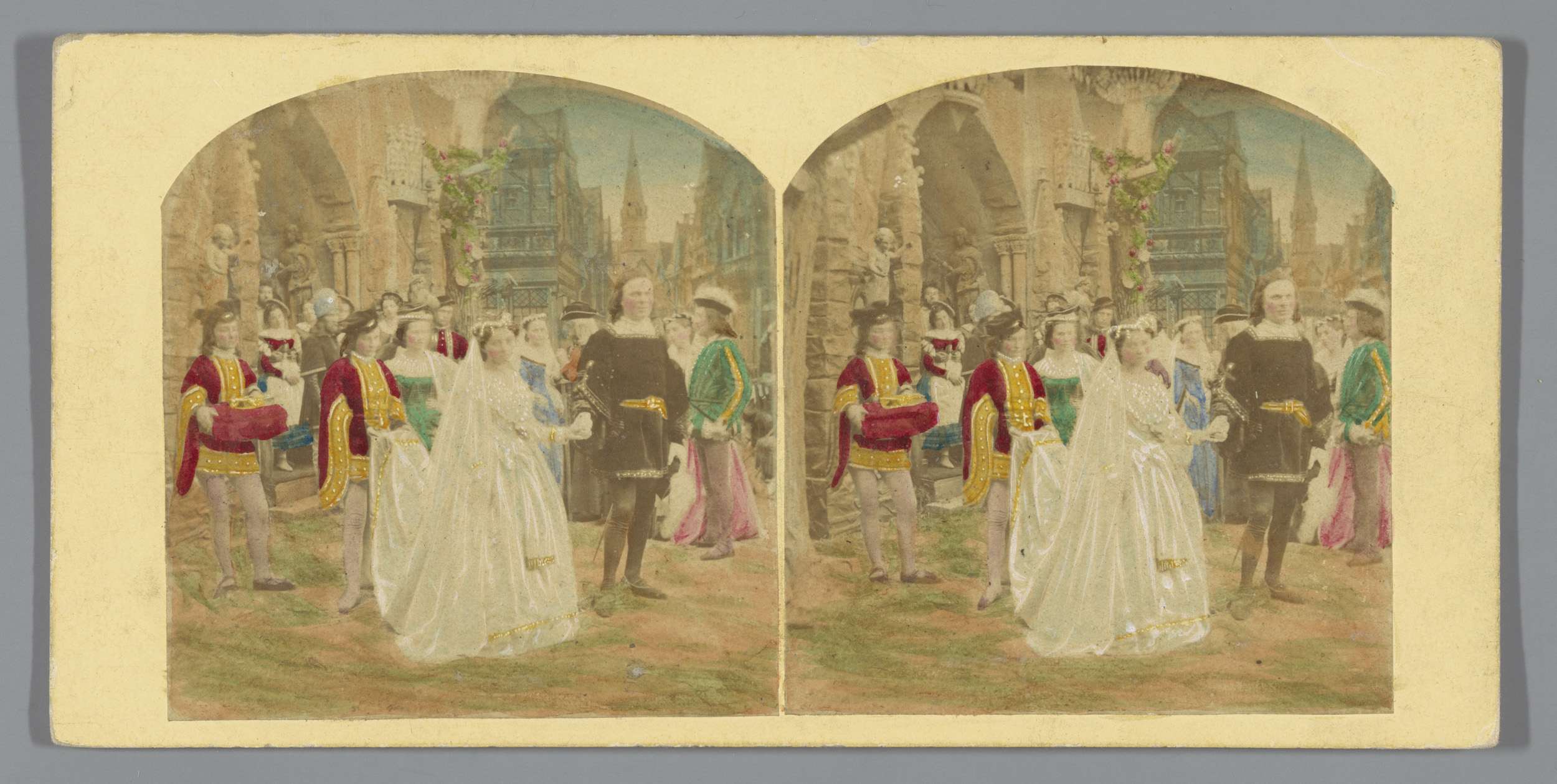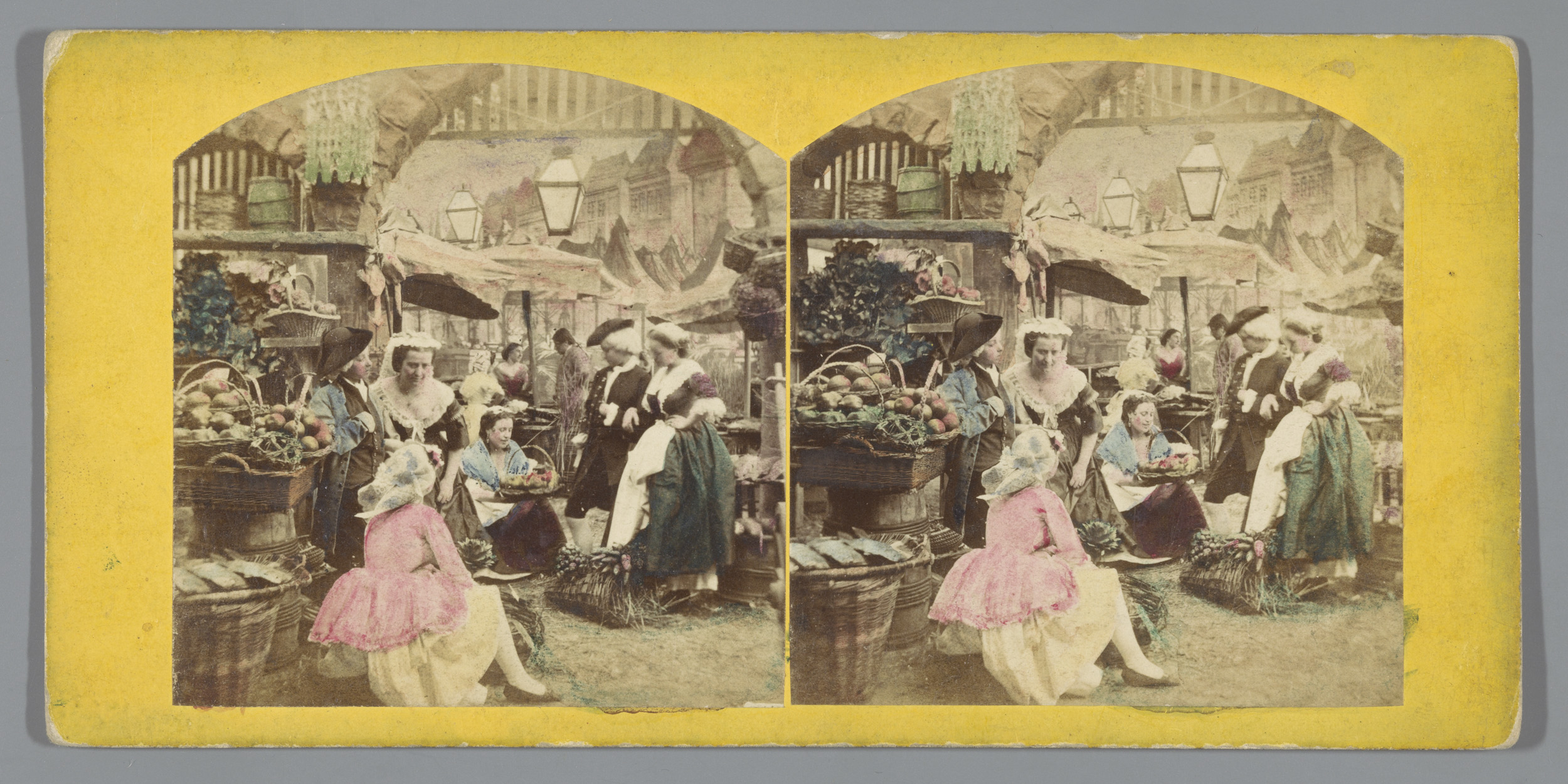 Koopvrouwen en wandelende paren in historisch kostuu...