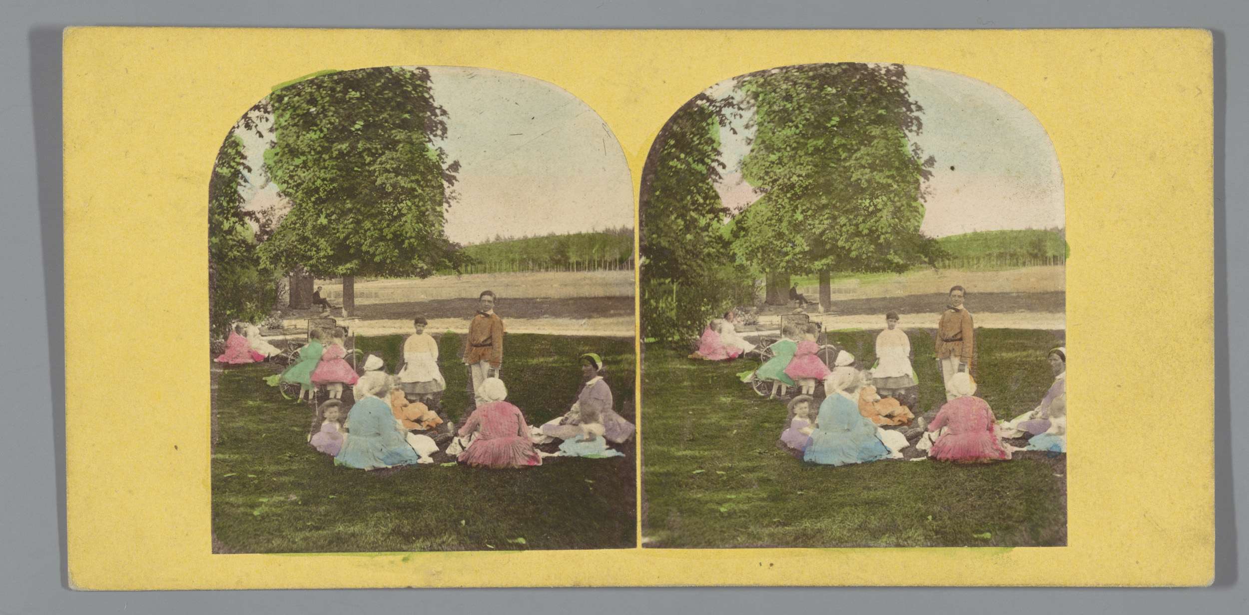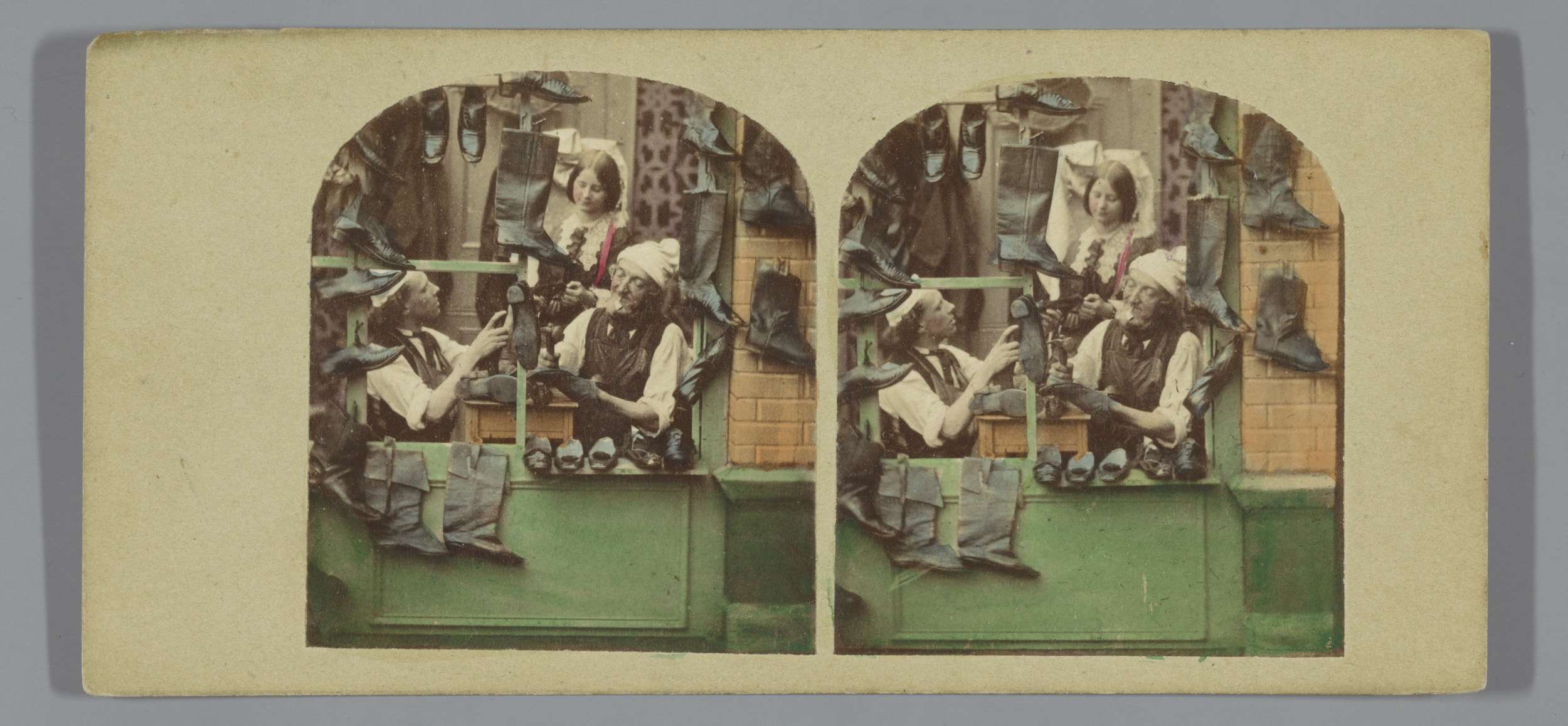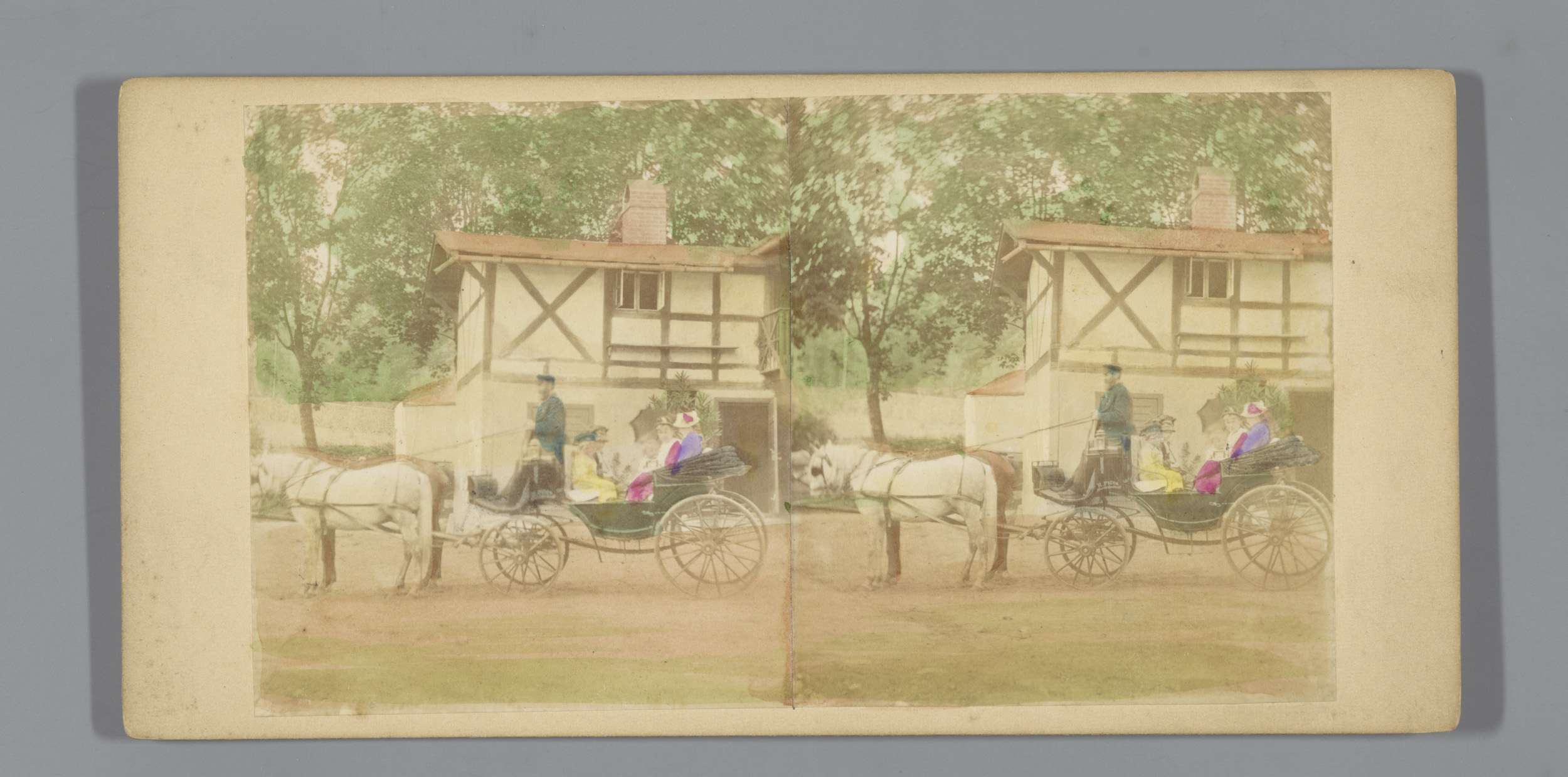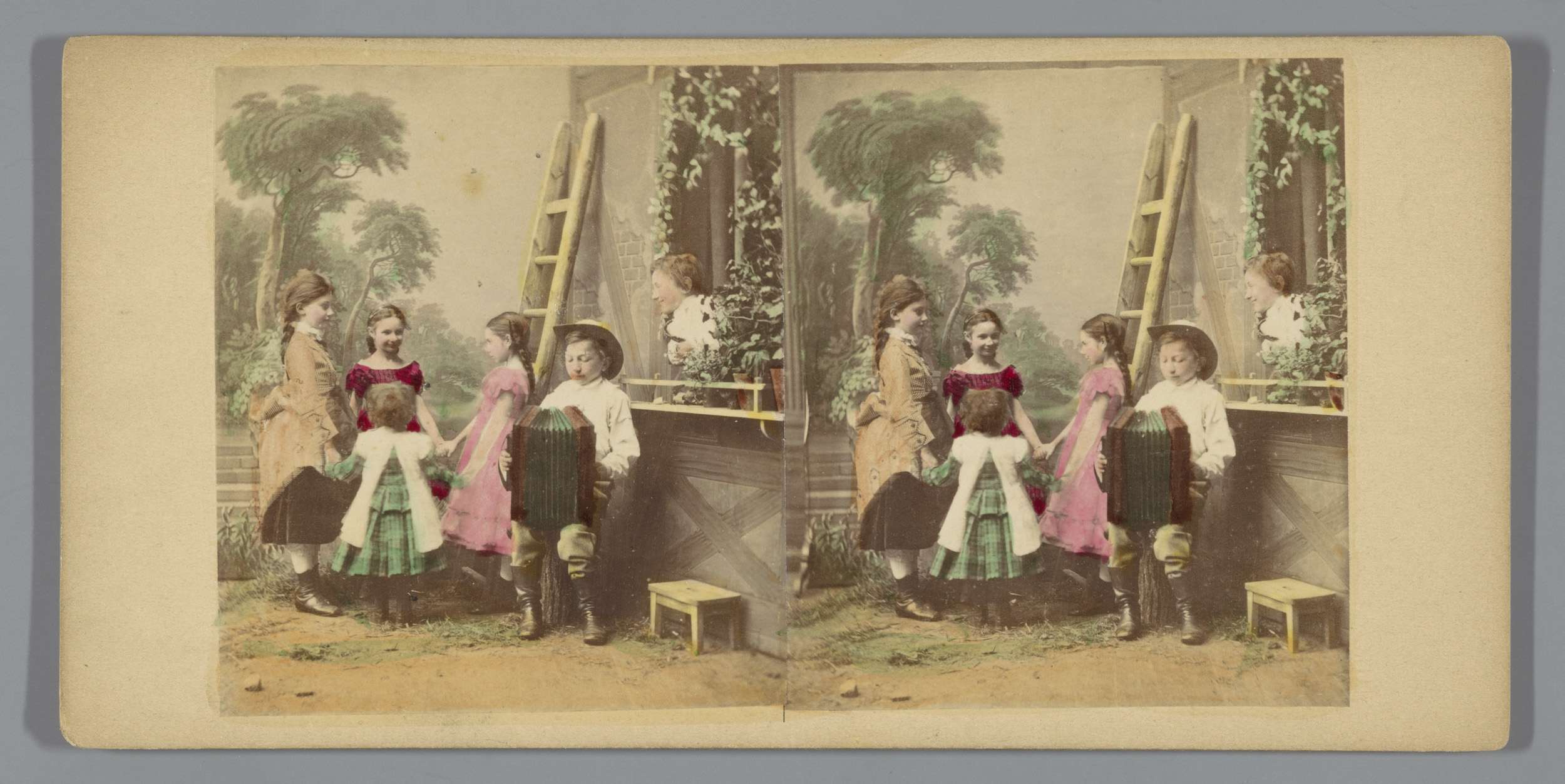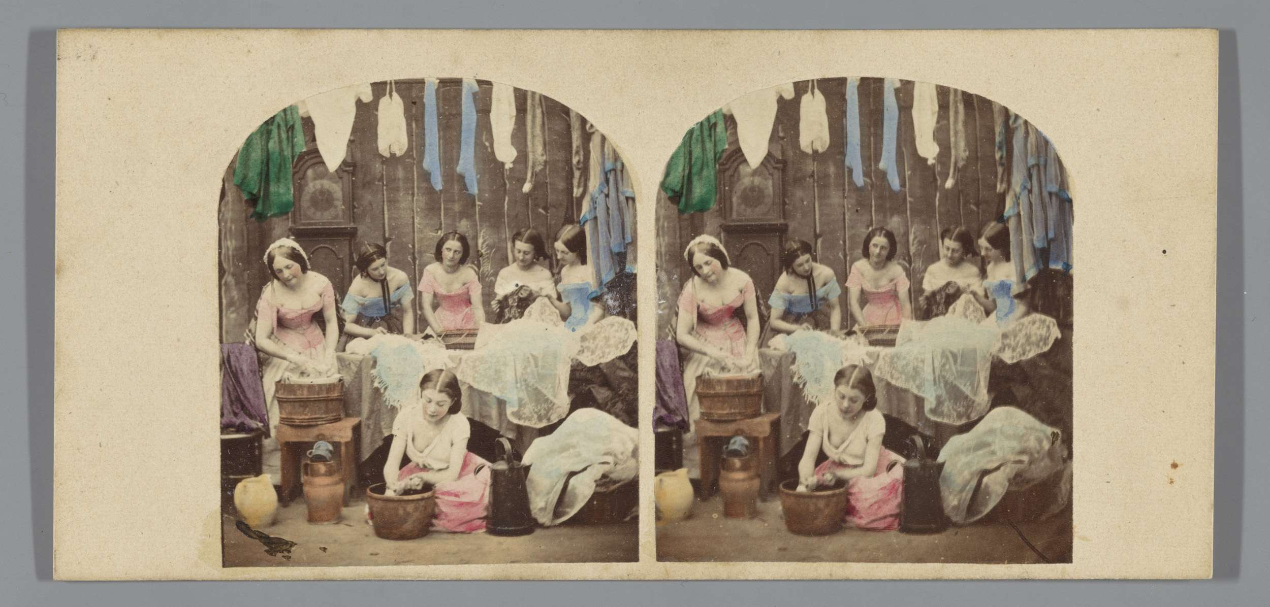 Koopvrouwen en wandelende paren in historisch kostuu...