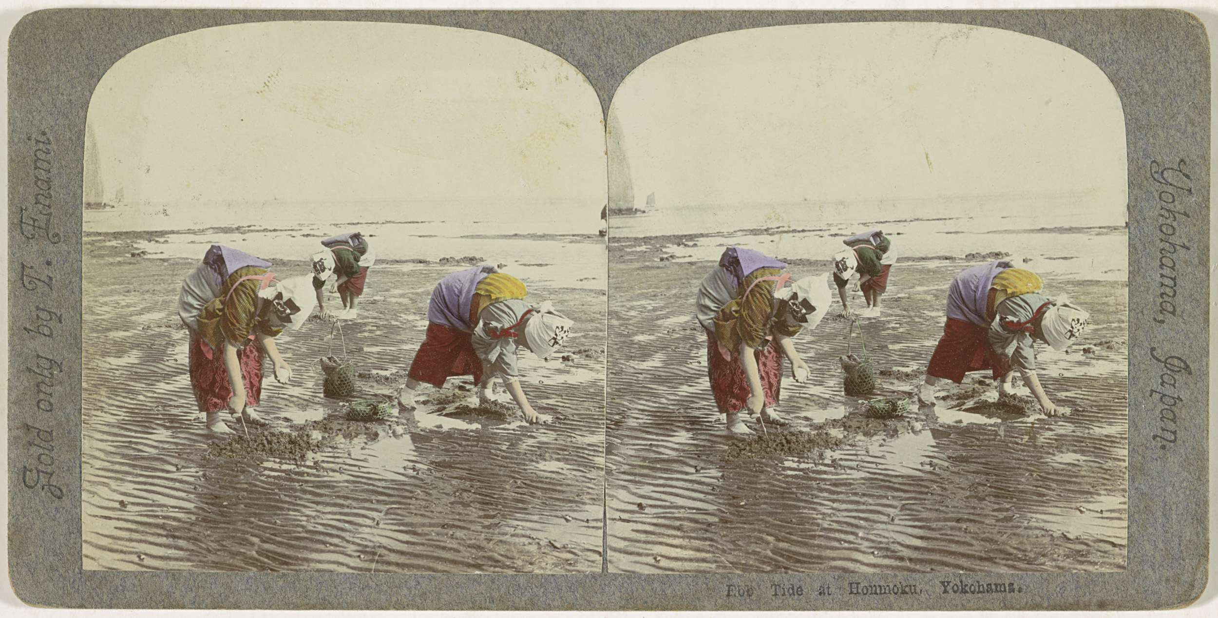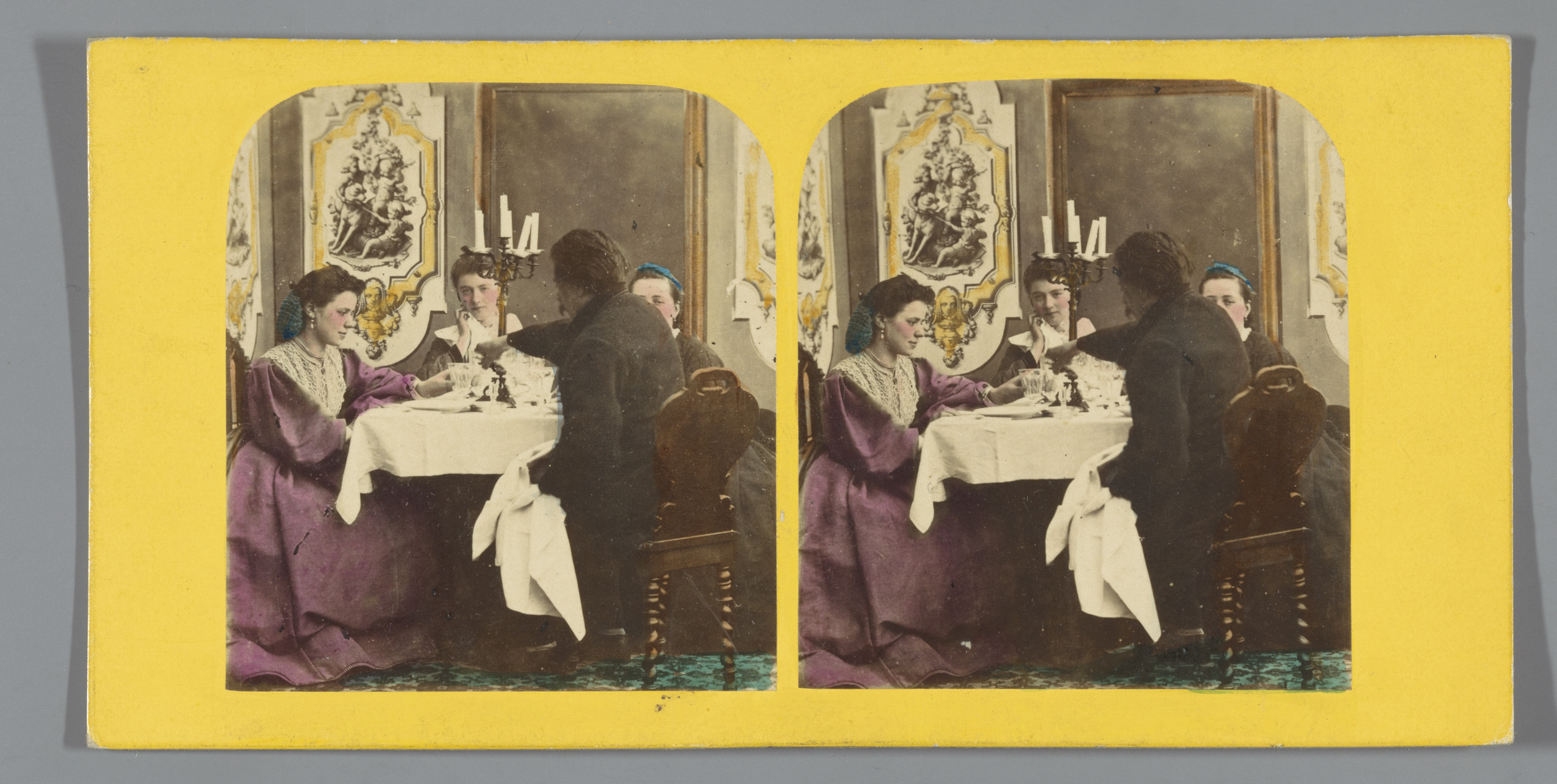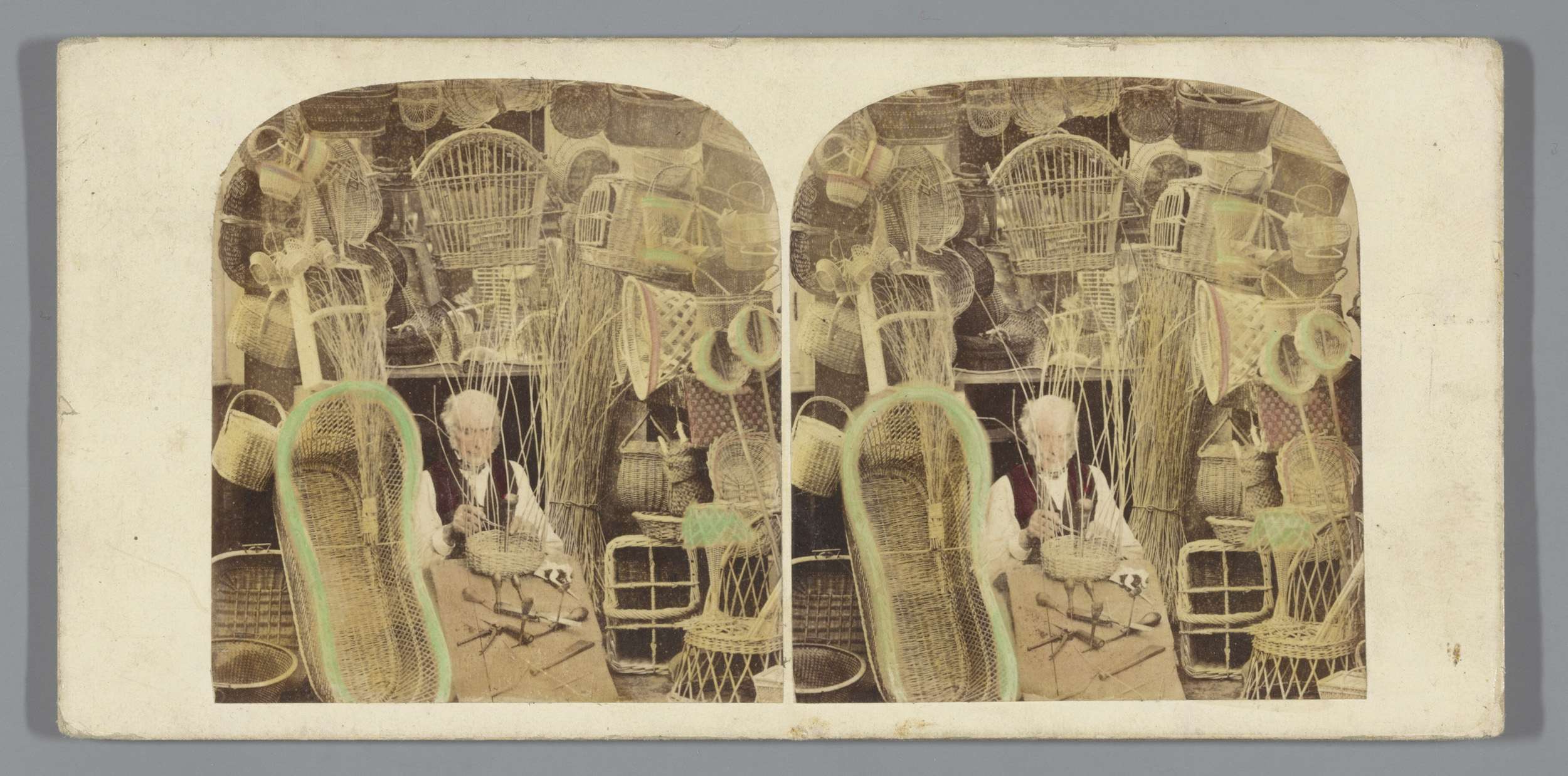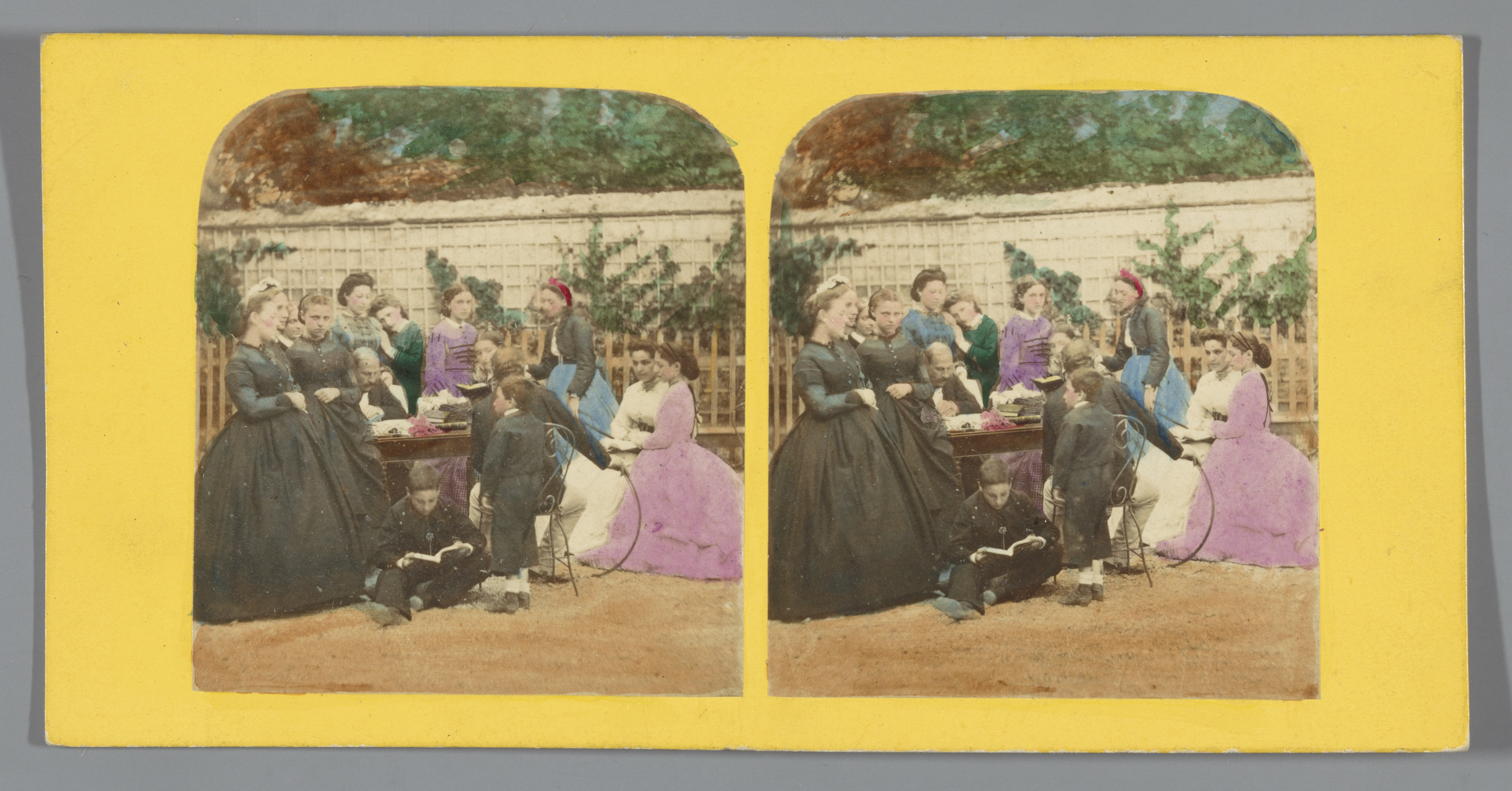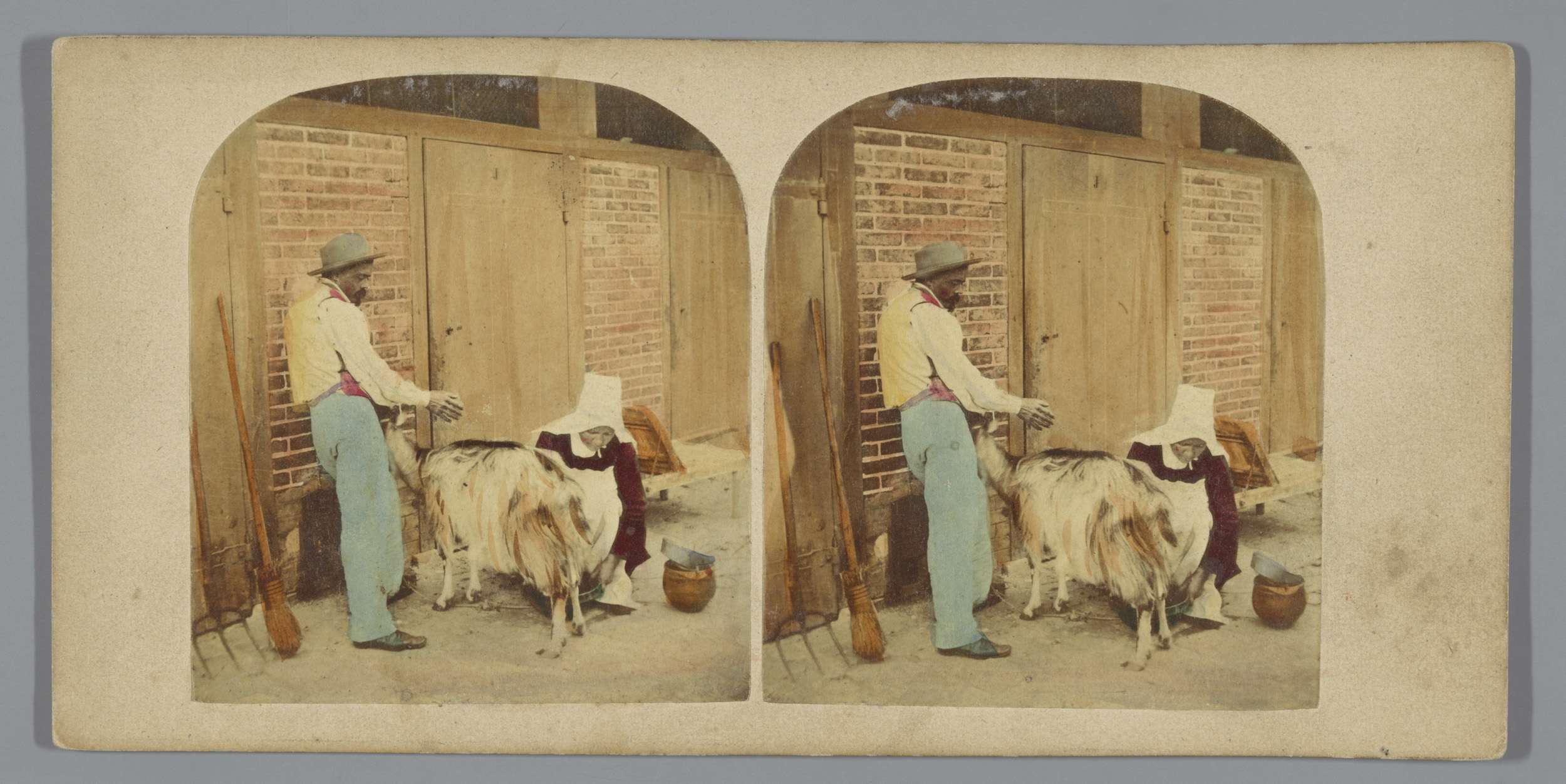 Koopvrouwen en wandelende paren in historisch kostuu...