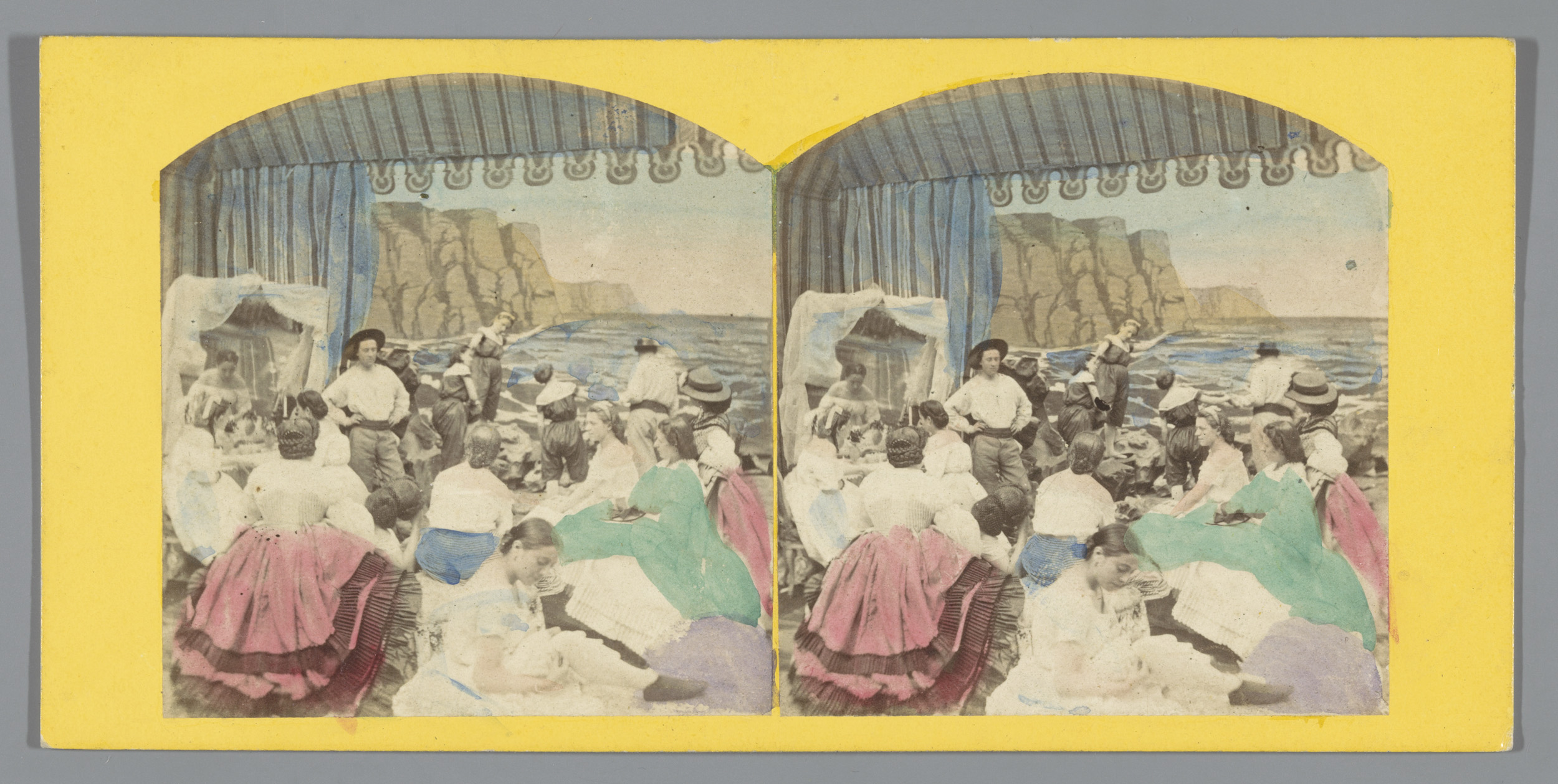Vrouwen gekleed in badpak voor een decor met een zee...