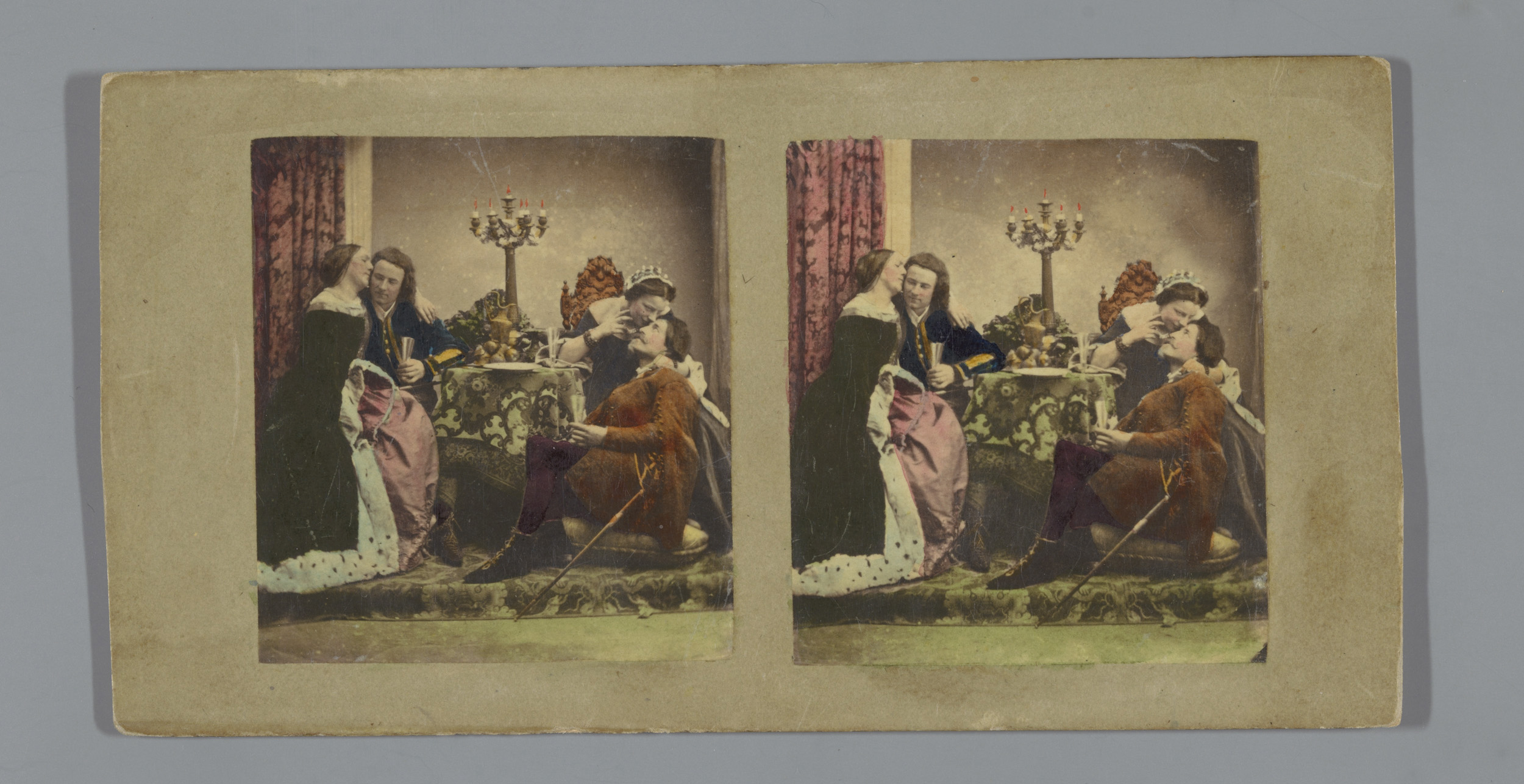 Vrouw in een hoepelrok zit een man achterna die op e...