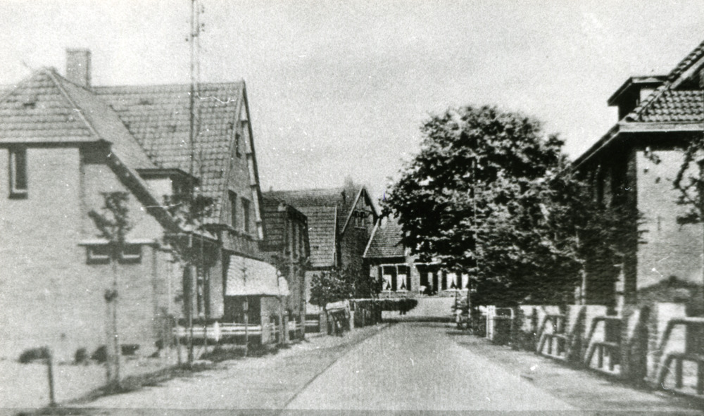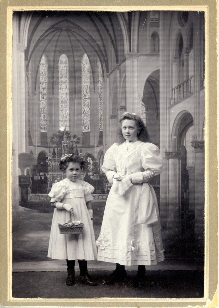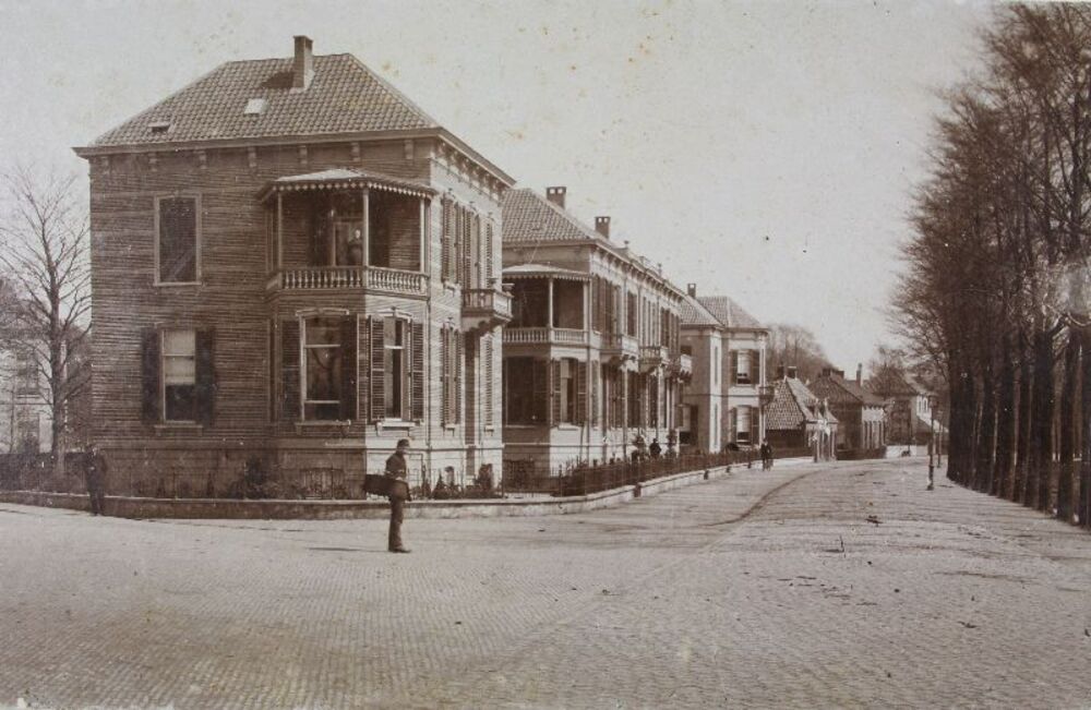 Zwart-wit foto op wit karton geplakt van een ansicht...