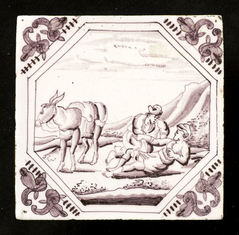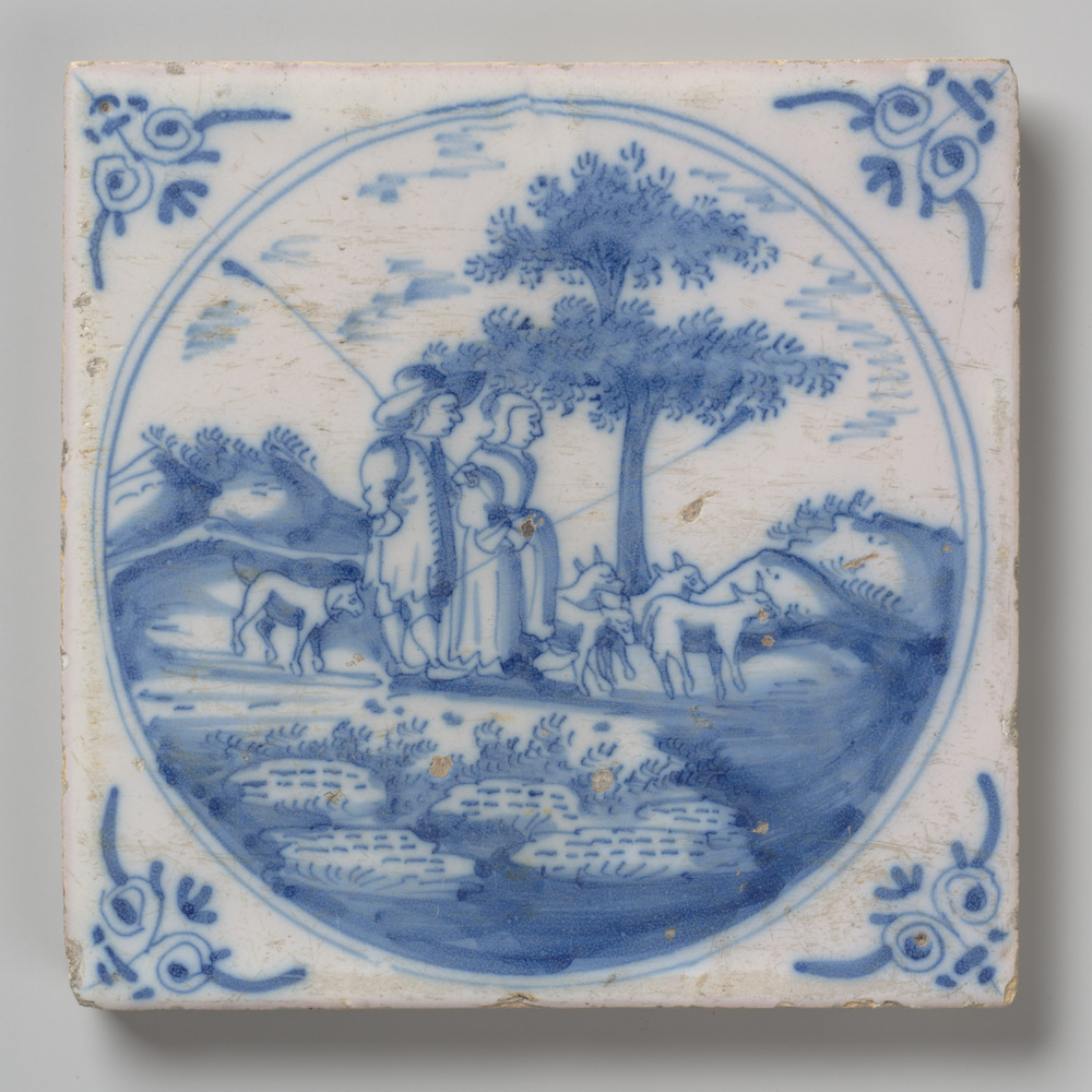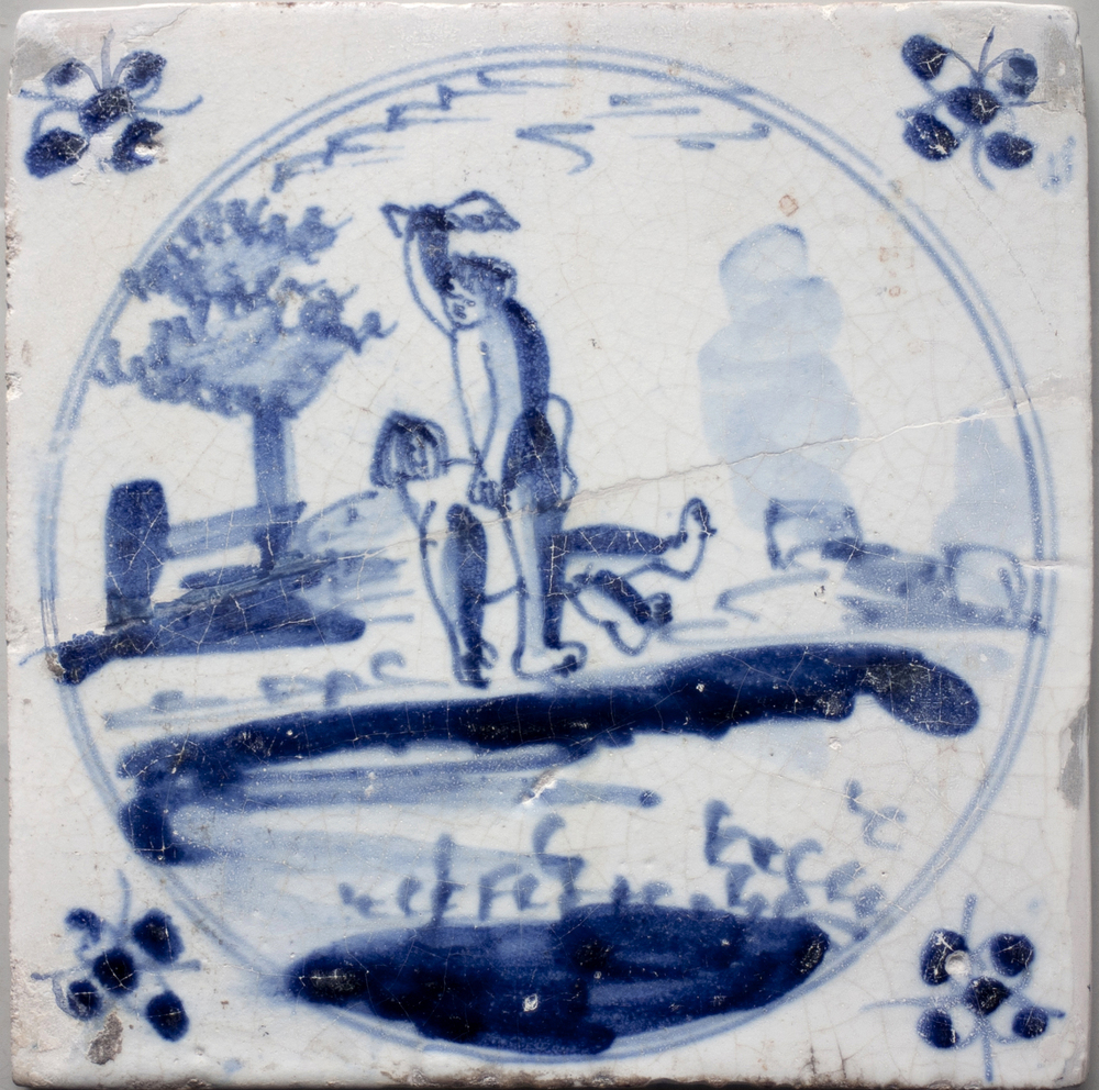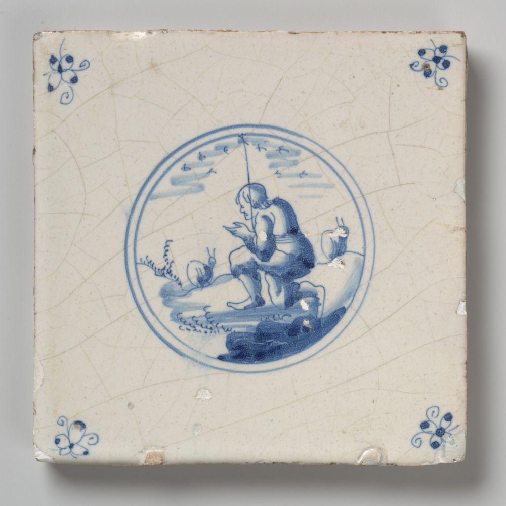 tegel van aardewerk met tinglazuur, voorstellende: k...