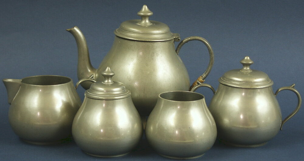 theeservies van tin, vervaardigd door Meeuws en Zoon...