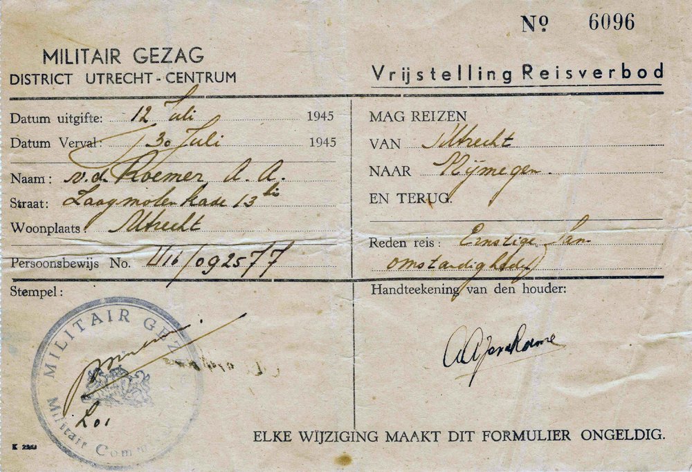 doortochtbewijs t.n.v. A.A. van de Roemer, 12-07-1945