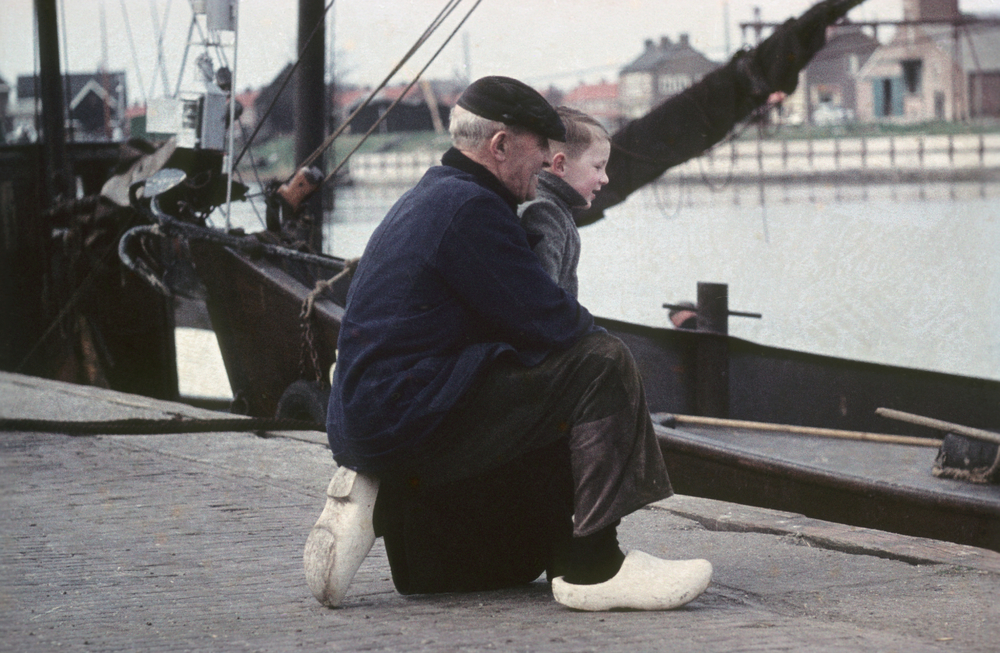 Een visserman kijkt naar aangemeerde schepen in de V...