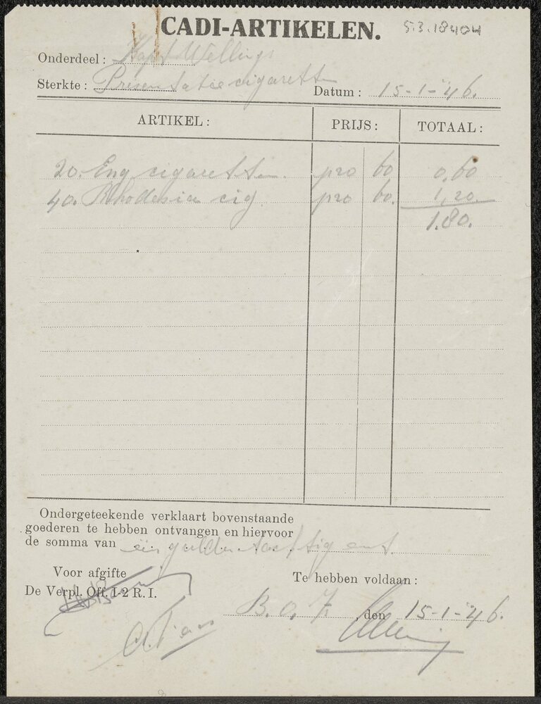 Rekening Cadi artikelen (20 Eng. sigaretten, 40 Rhod...
